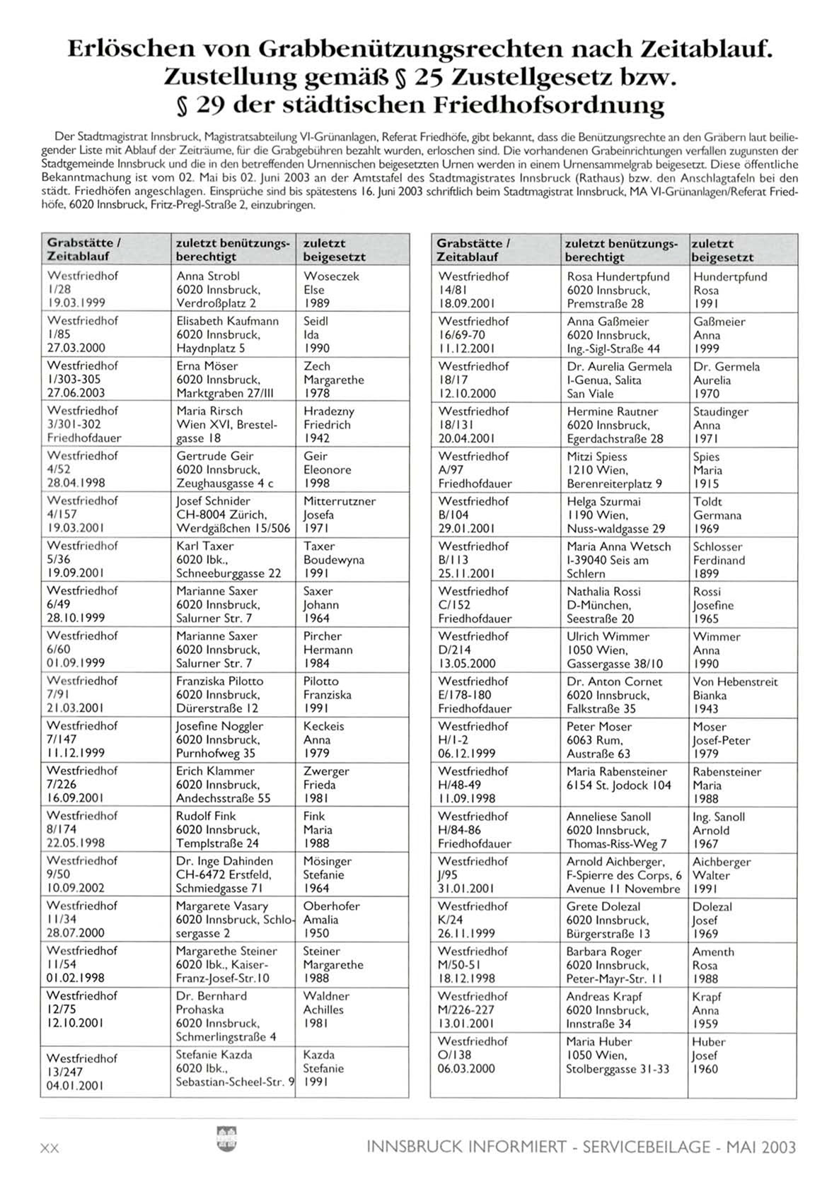 Der Stadtmagistrat Innsbruck, Magistratsabteilung Vl-Grünanlagen, Referat Friedhöfe, gibt bekannt, dass die Benutzungsrechte an den Grabern laut beiliegender Liste mit Ablauf der Zeiträume, für die Grabgebühren bezahlt wurden, erloschen sind. Die vorhandenen Grabeinrichtungen verfallen zugunsten der
