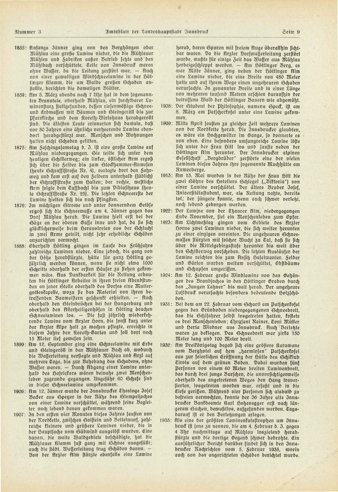 auch die städt. Wasserleitung trug Schäden davon. Von der Arzler Alm stürzte ebenfalls eine Lawine