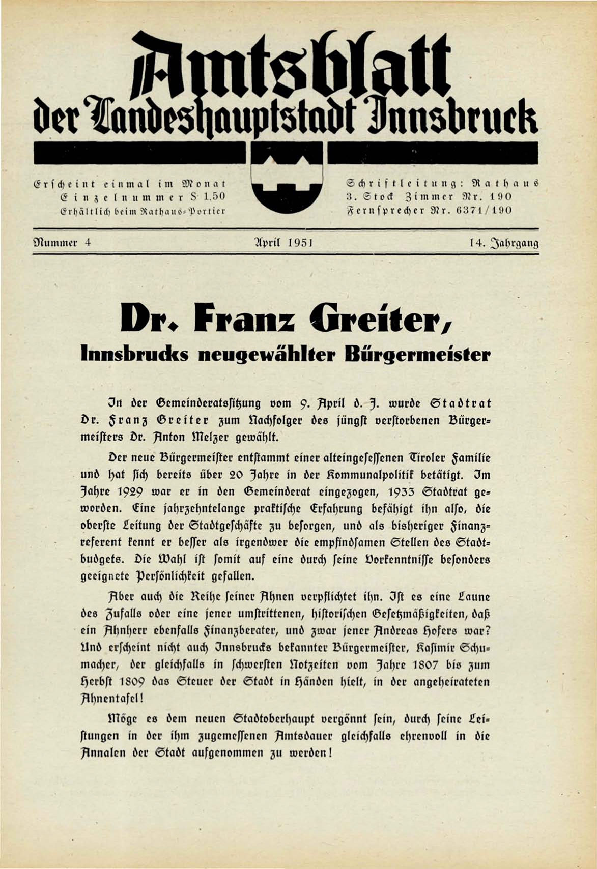 d r . K r a n z G r e i t e r Zum Nachfolger des jüngst verstorbenen Bürgermeisters Or. ftnton Melzer gewählt.