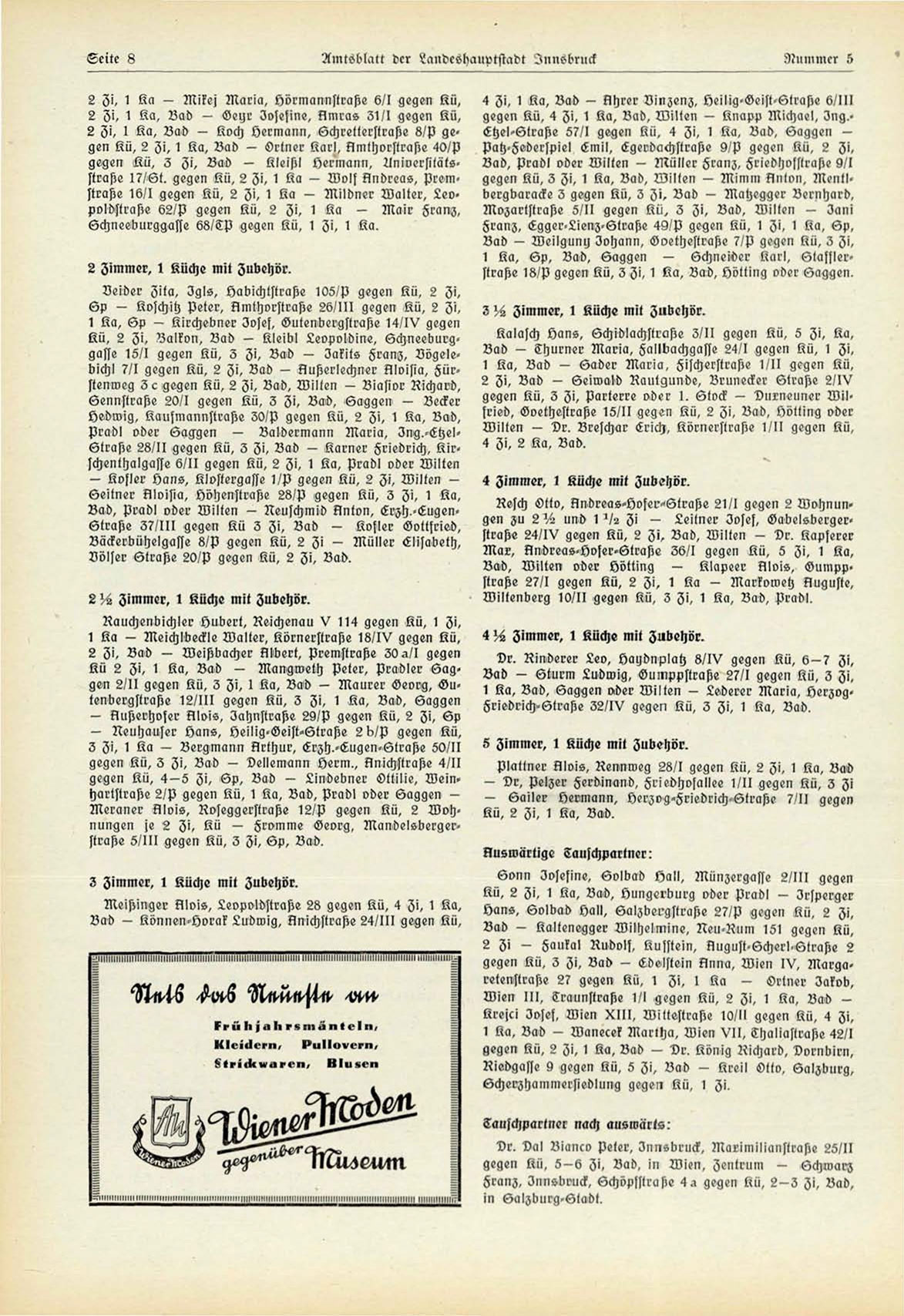 pradl oder Sassgen — Baldermann Maria, Inig.-LhelStrafte 28/11 gegen Kü, 3 Zi, Bad — Karner Friedrich, Kirschenthalgasse 6/II gegen Kll, 2 Zi, 1 Ka, pradl oder Wüten