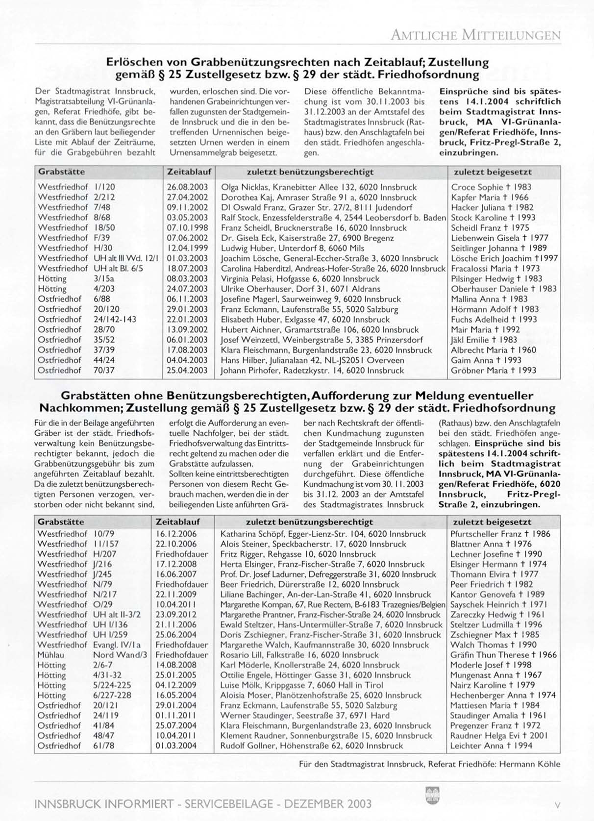 w u r d e n , erloschen sind. Die vorhandenen Grabeinrichtungen verfallen zugunsten der Stadtgemeinde Innsbruck und die in den betreffenden Urnennischen beigesetzten Urnen werden in einem