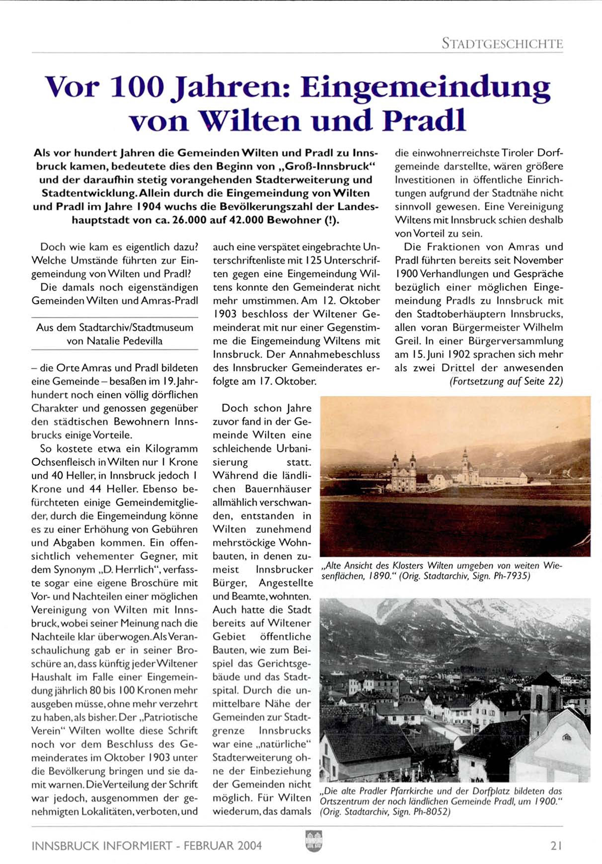 A l s v o r h u n d e r t J a h r e n die G e m e i n d e n W i l t e n u n d P r a d l z u Innsb r u c k k a m e n , b e d e u t e t e dies d e n B e g i n n v o n „ G r o ß - I n n s b r u c k "