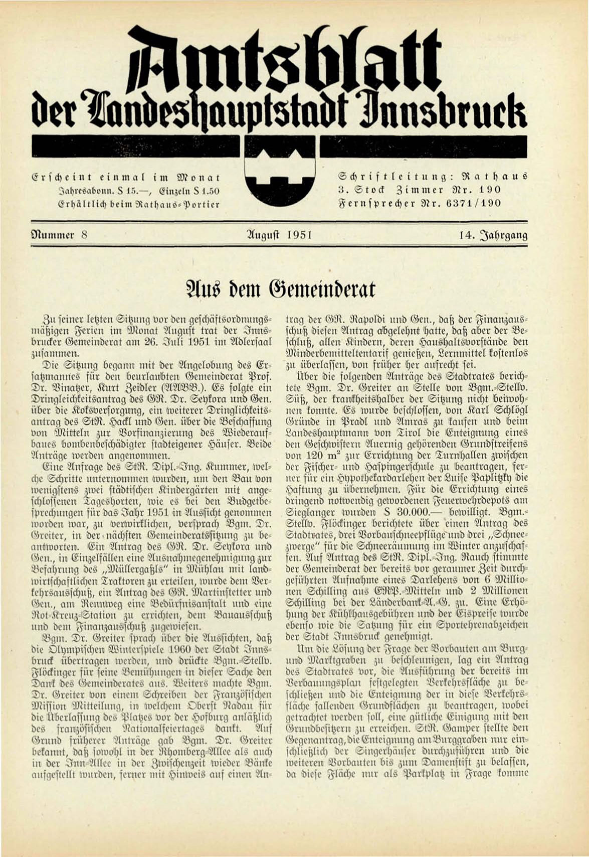 Zu seiner letzteir Sitzung vor den gcschäftsordnungsmäßigen Ferien im Monat Angnst trat der Innsbrucker Gemeinderat am 2(>. I n l i 1951 im Adlcrsaal