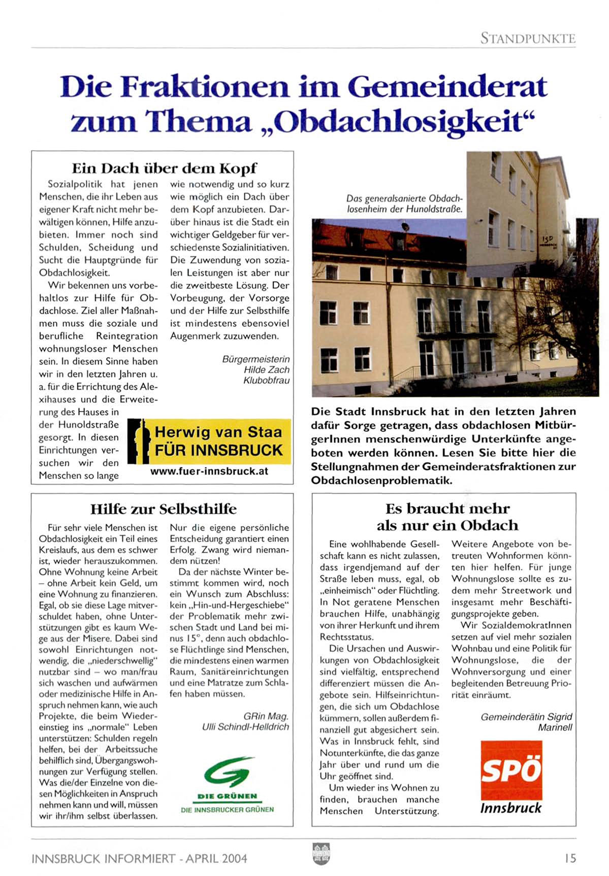 dafür Sorge getragen, dass obdachlosen Mitbürgerinnen menschenwürdige U n t e r k ü n f t e angeboten werden können. Lesen Sie b i t t e hier die