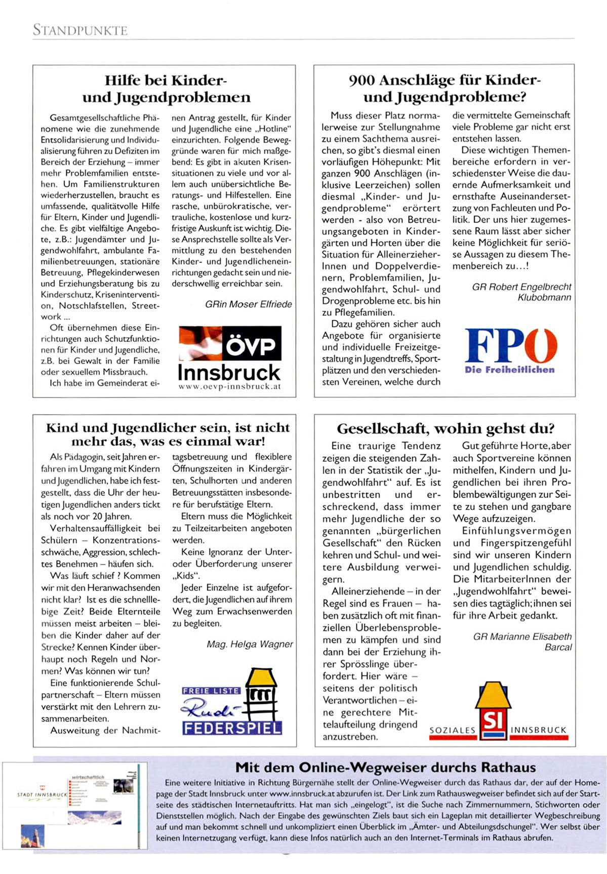 Eine weitere Initiative in Richtung Bürgemähe stellt der Online-Wegweiser durch das Rathaus dar, der auf der Homepage der Stadt Innsbruck unter www.innsbruck.at abzurufen ist. Dei Link /um Rathauswegweiser befindet sich auf der Startseite des städtischen Internetauftritts. Hat man sich „eingelegt", ist die Suche nach Zimmernummern, Stichworten oder