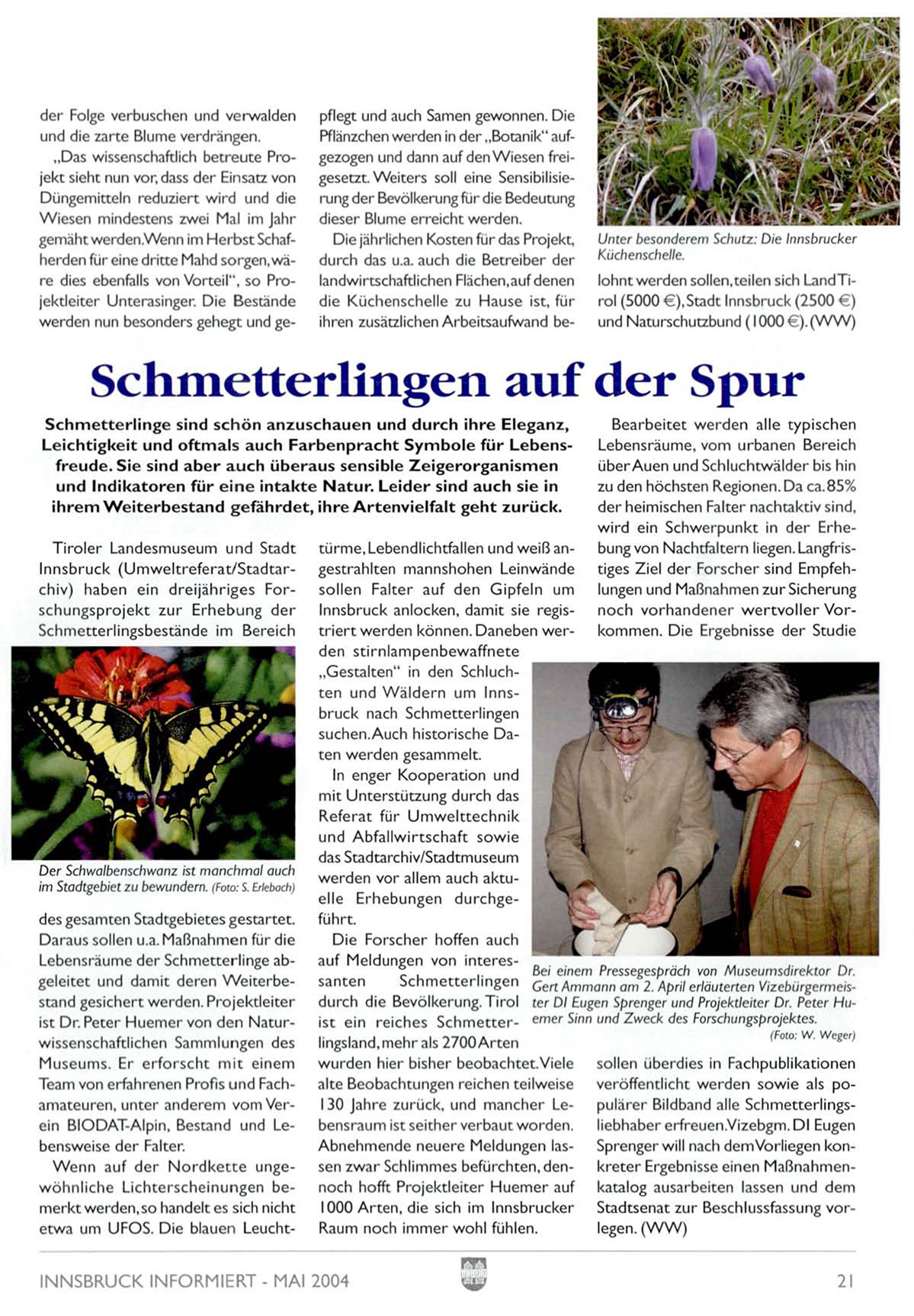 durch die Bevölkerung. Tirol ter DI Eugen Sprenger und Projektleiter Dr. Peter Hüist Dr. Peter Huemer von den Naturlst ein reiches Schmetter- emer Sinn und Zweck des Forschungsprojektes.