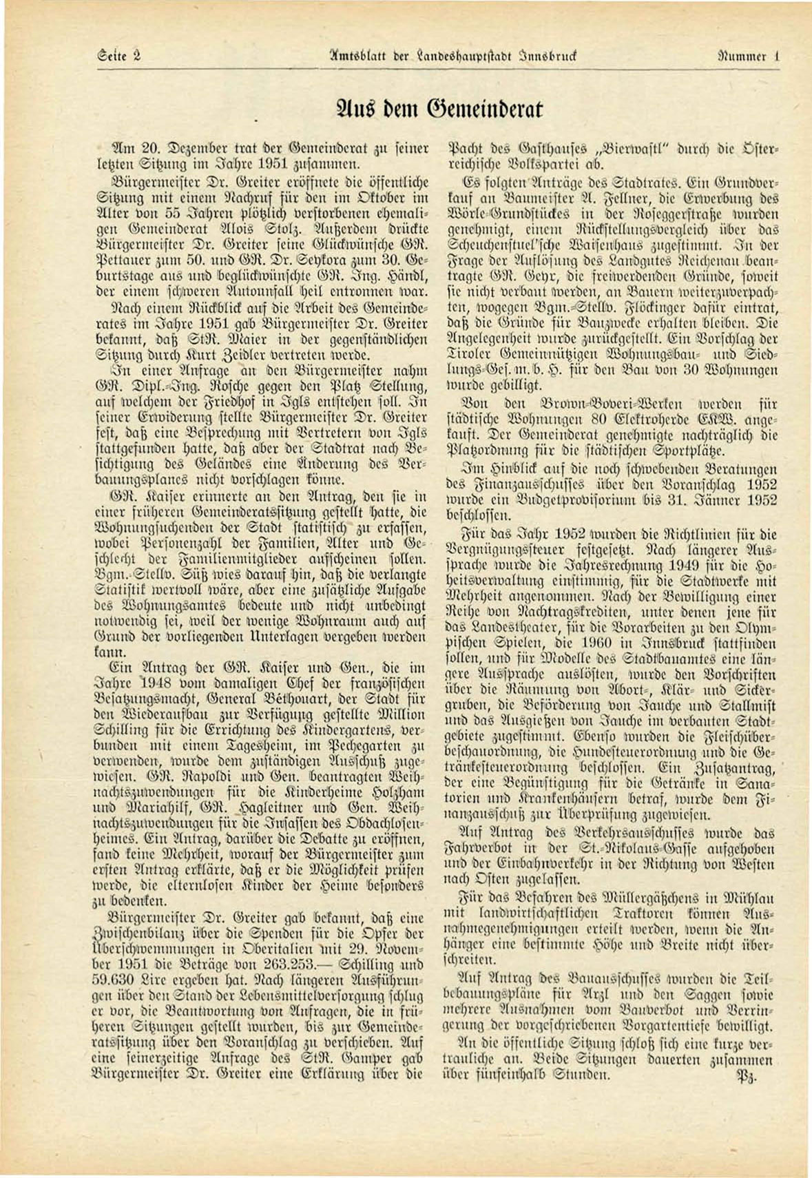 ^)tach einem Rückblick auf die Arbeit des Gemeinderates i m Jahre 1951 gab Bürgermeister D r . Greiter