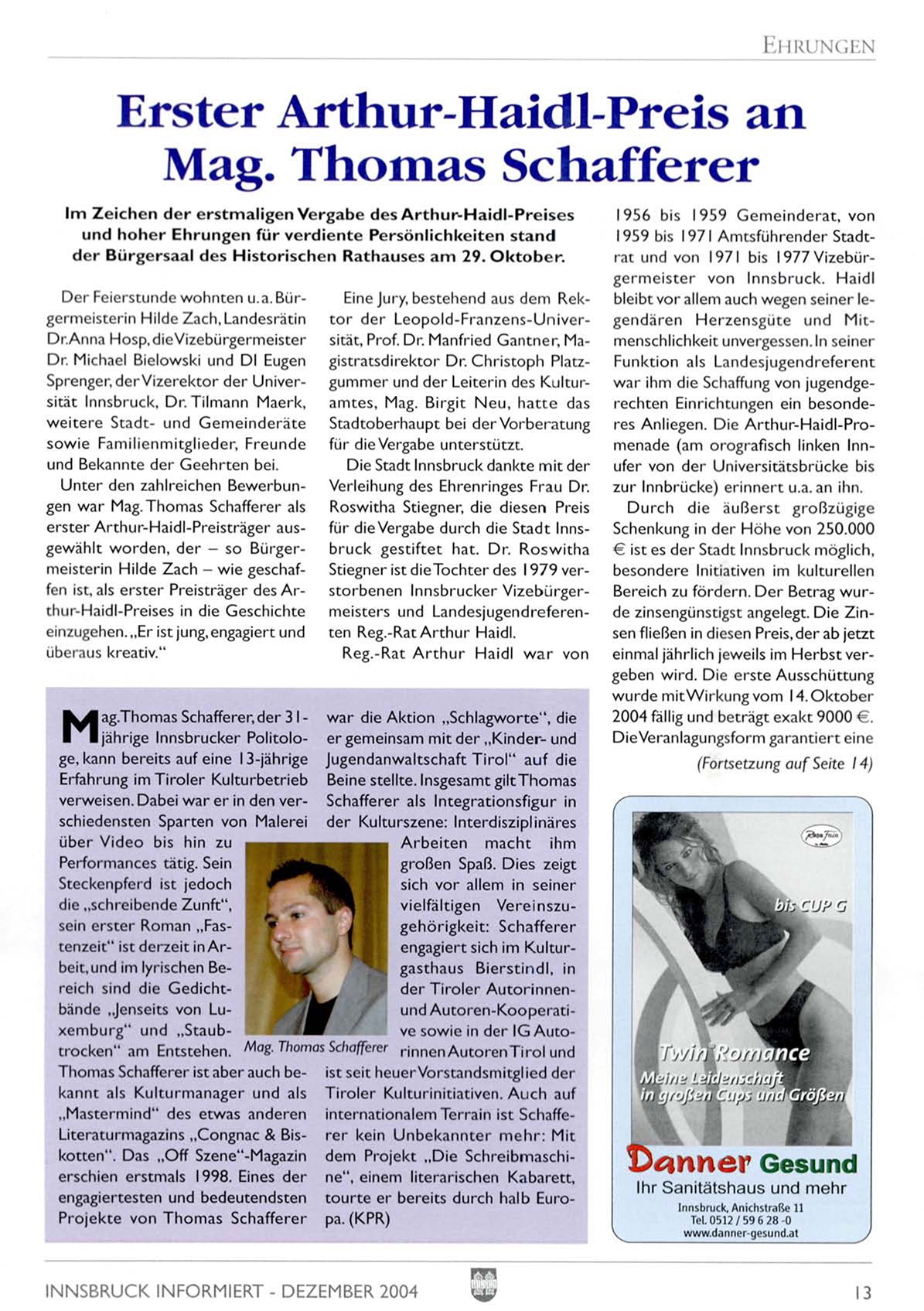erster Arthur-Haidl-Preisträger ausgewählt w o r d e n , der - so Bürgermeisterin Hilde Zach - wie geschaffen ist, als erster Preisträger des Arthin-Haidl-Preises in die Geschichte