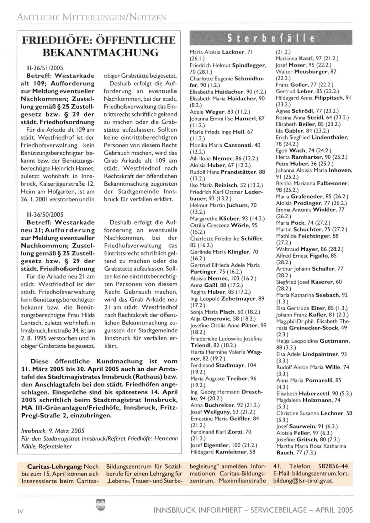 3 I . M ä r z 2005 b i s 3 0 . A p r i l 2005 a u c h a n d e r A m t s t a f e l des S t a d t m a g i s t r a t e s I n n s b r u c k ( R a t h a u s ) b z w .