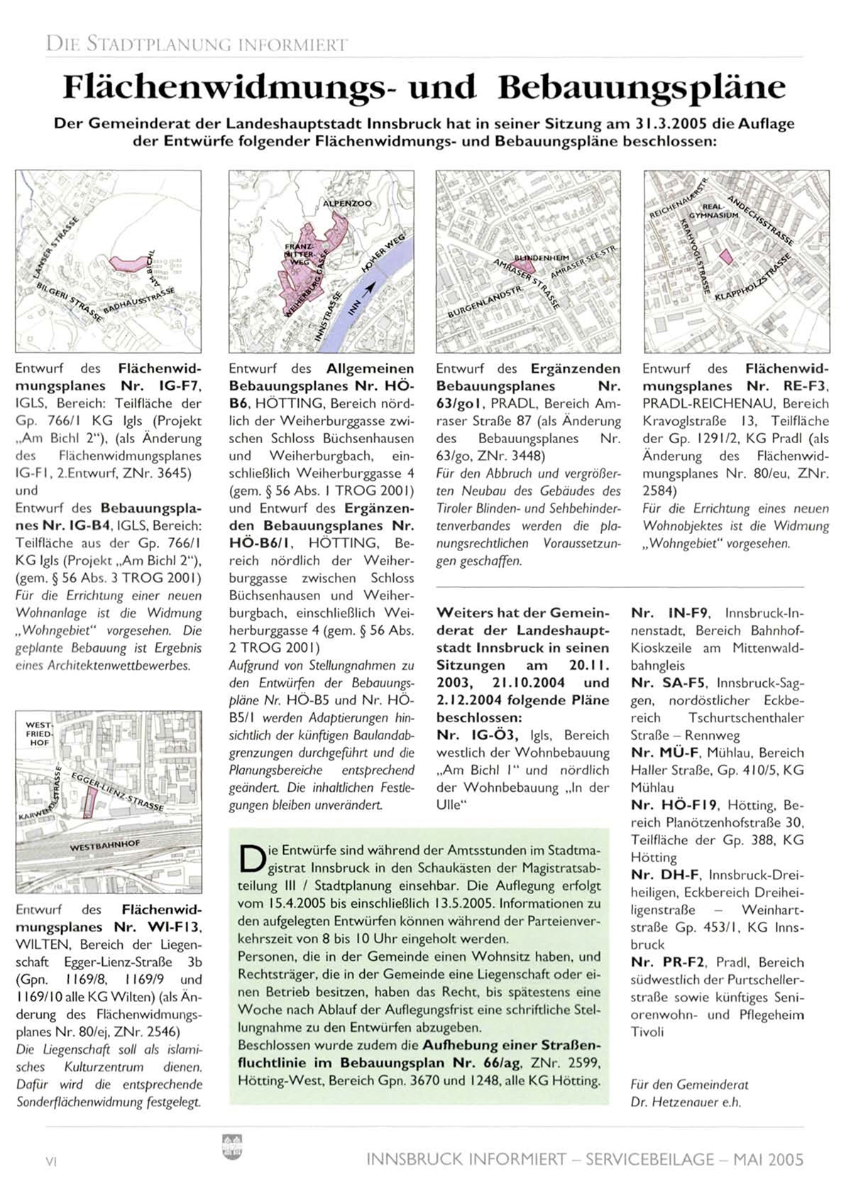 ie Entwürfe sind während der Amtsstunden im Stadtmagistrat Innsbruck in den Schaukästen der Magistratsabteilung III / Stadtplanung einsehbar. Die Auflegung erfolgt