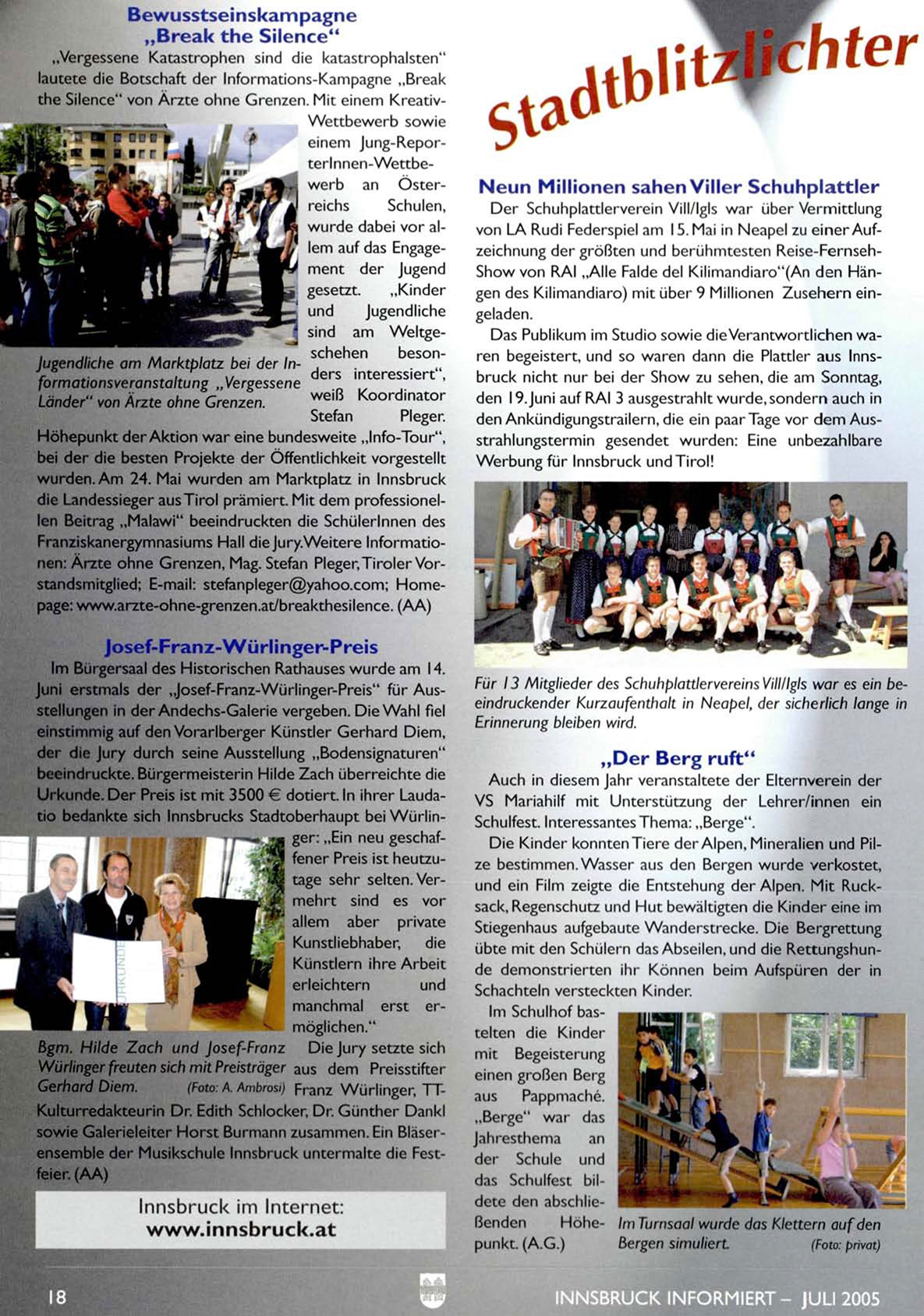 Urkunde. Der Preis ist mit 3500 € dotiert. In ihrer Laudatio bedankte sich Innsbrucks Stadtoberhaupt bei W ü r l i n ger: „Ein neu geschaffener Preis ist heutzutage sehr selten. Vermehrt sind es vor