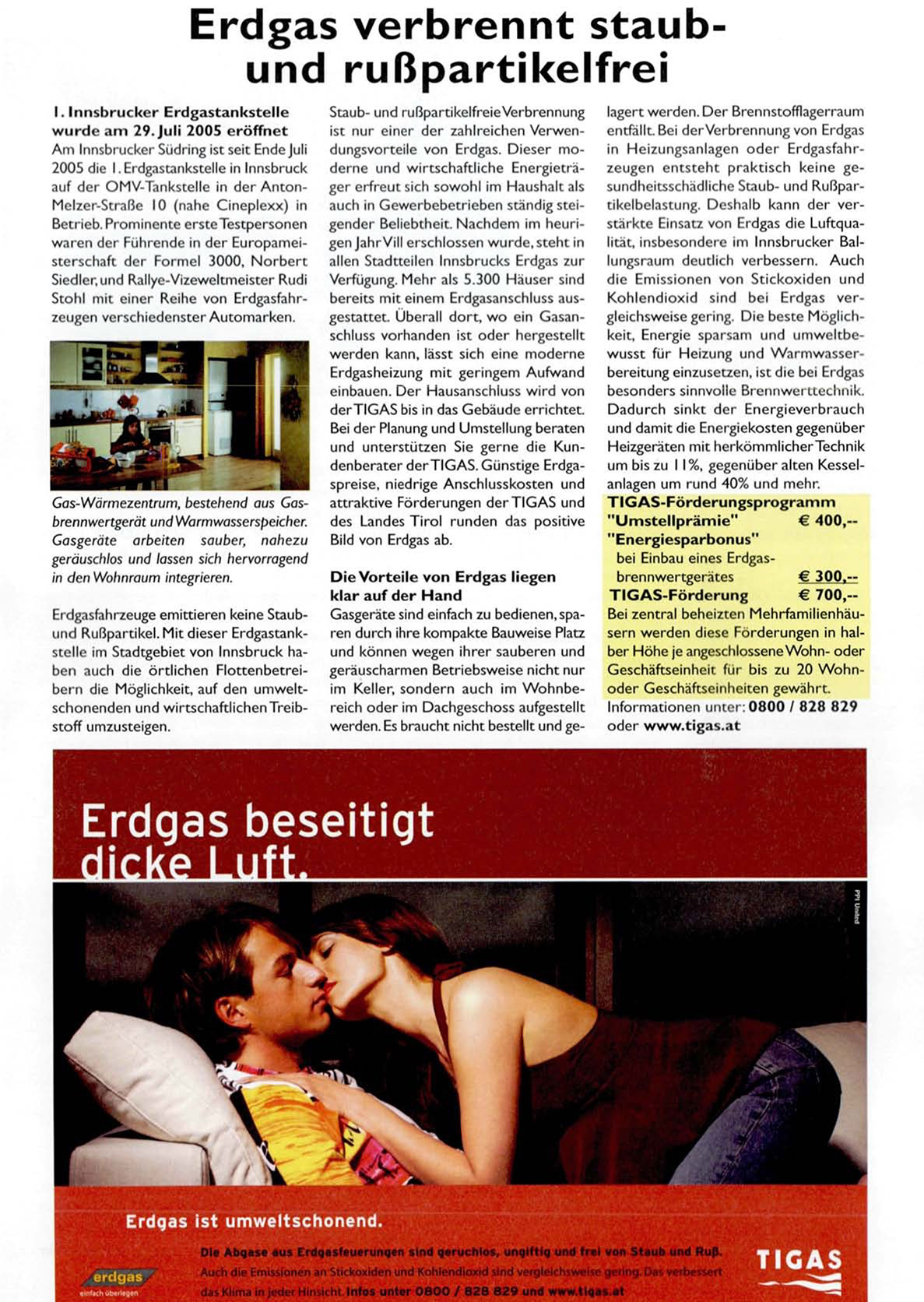 in Heizungsanlagen o d e r Erdgasfahrzeugen entsteht praktisch keine gesundheitsschädliche Staub- und Rußpartikelbelastung. Deshalb kann der verstärkte Einsatz von Erdgas die Luftqualität, insbesondere im Innsbrucker Ballungsraum deutlich verbessern. Auch