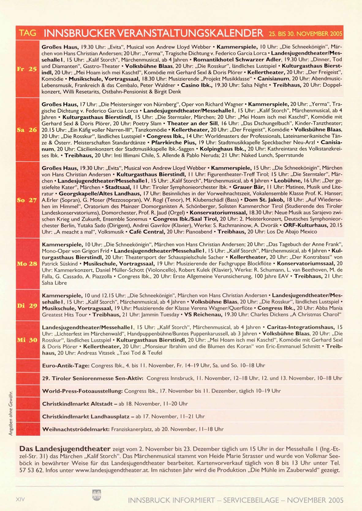 von Hans Christian Andersen • Kulturgasthaus Bierstindl, I I Uhr: Figurentheater-Treff Tirol; 15 Uhr: „Die Sterntaler", Märchen • Landesjugendtheater/Messehalle 1,15 Uhr: „Kalif Storch", Märchenmusical, ab 4 Jahren • Leobühne, I 6 Uhr: „Der gestiefelte Kater", Märchen • Stadtsaal, I I Uhr: Tiroler Symphonieorchester Ibk. • Grauer Bär, I I Uhr: Matinee, Musik und Literatur • Georgskapelle/Altes Landhaus, 17 Uhr: Besinnliches in der Vorweihnachtszeit, Vokalensemble Klasse Prof. K. Hanser;