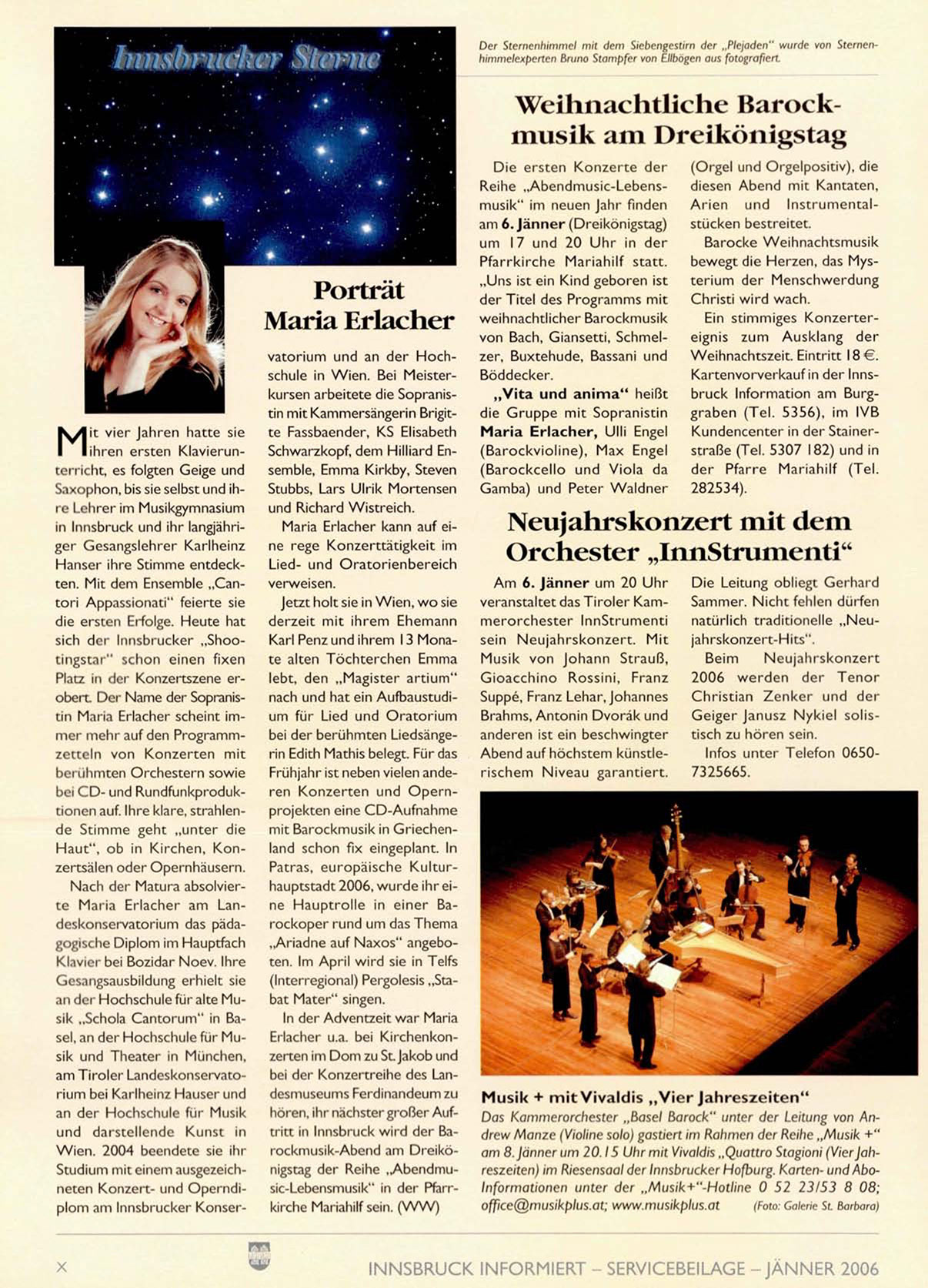 hören, ihr nächster großer Auftritt in Innsbruck wird der Barockmusik-Abend am Dreikönigstag der Reihe „Abendmusic-Lebensmusik" in der Pfarrkirche Mariahilf sein. ( W W )