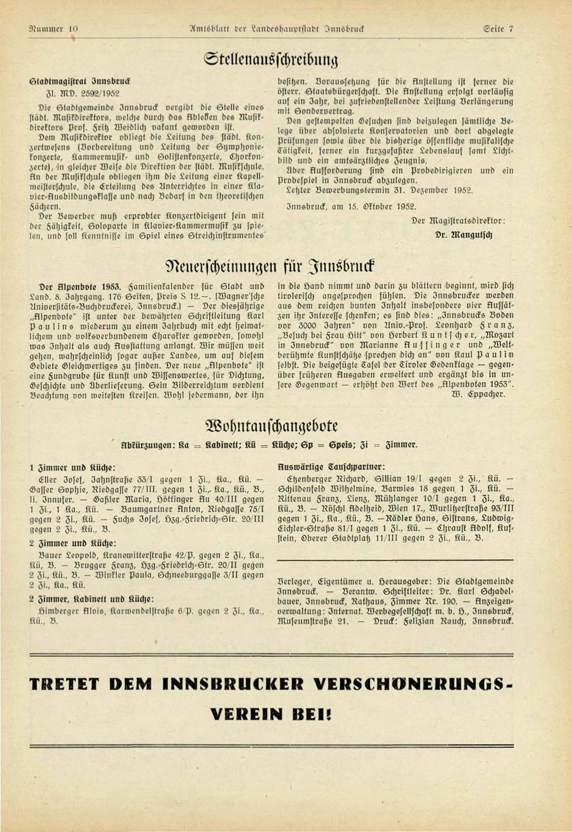 Innsbruck. — Verantm. Schriftleiter: Dr. Kar! Schädelbauer, Innsbruck, Rathaus, Zimmer Rr. 190. — Anzeigenuermaltung: Internat. Werbegesellschaft m. b. h., Innsbruck,
