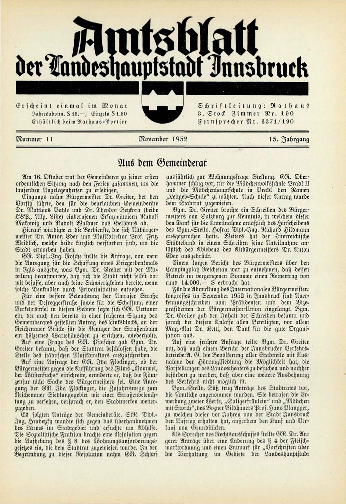 Für die Abwicklung des Internationalen Bürgermeisterkongresses im September 1952 in Innsbruck sind Anerkennungsschreiben vom Präsidenten und dem Vizepräsidenten der Bürgermeister-Union eingelangt. Bgm.