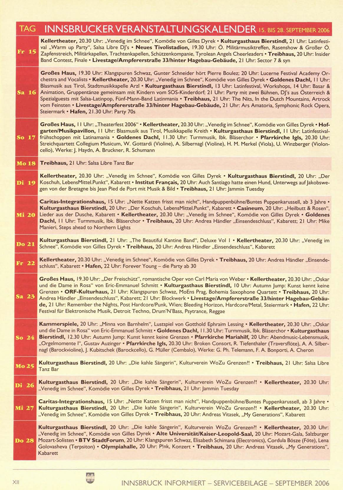 1 Großes Haus, 11 Uhr: „Theaterfest 2006" • Kellertheater, 20.30 Uhr: „Venedig im Schnee", Komödie von Gilles Dyrek • Hofgarten/Musikpavillon, 11 Uhr: Blasmusik aus Tirol, Musikkapelle Kreith • Kulturgasthaus Bierstindl, 11 Uhr: Latinfestival1 7 frühschoppen mit Latinamania • Goldenes Dachl, 11.30 Uhr: Turmmusik, Ibk. Bläserchor • Pfarrkirche Igls, 20.30 Uhr: