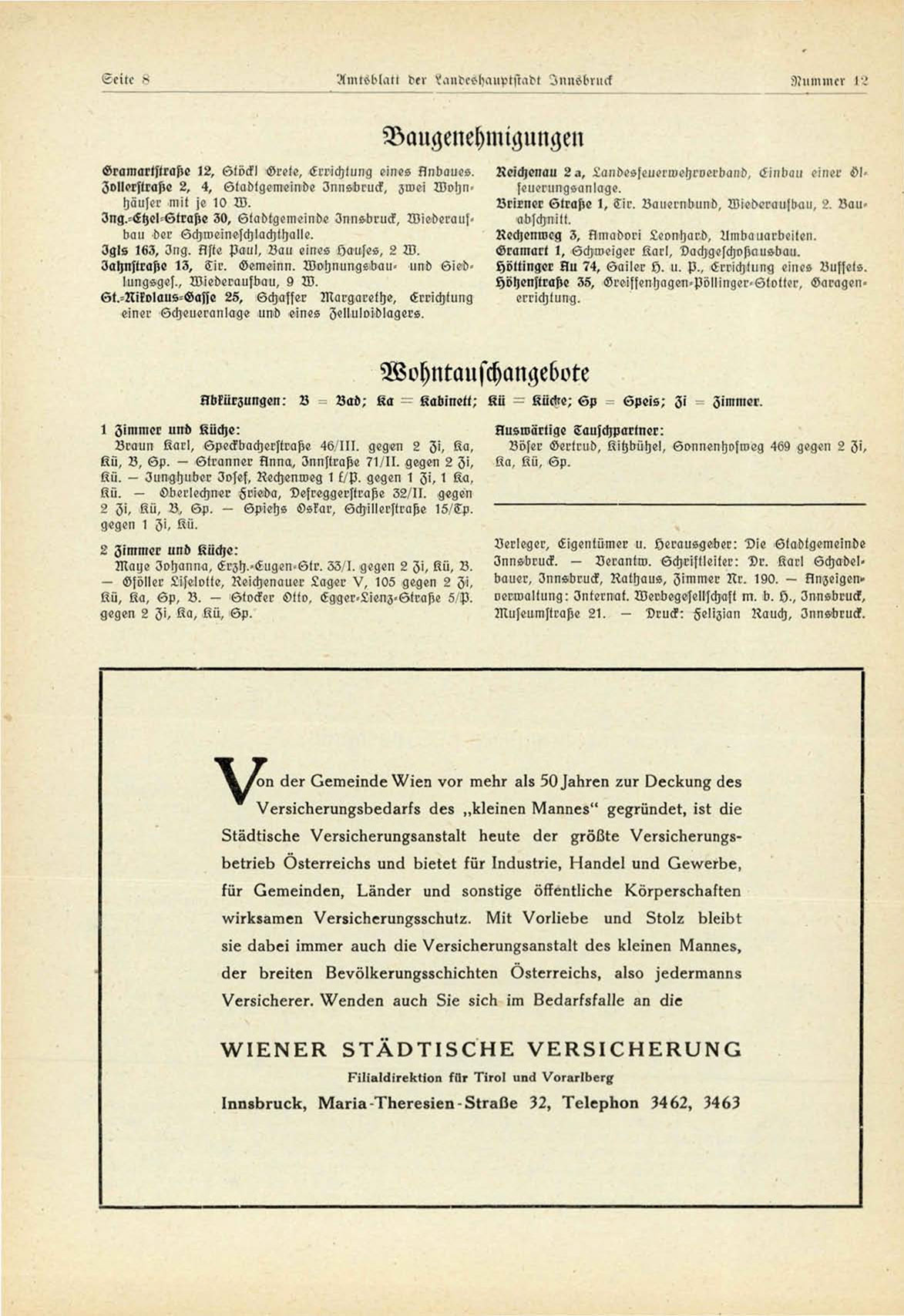 bauer, Innsbruck, Rathaus, Zimmer Rr. 190. — Anzeigen»