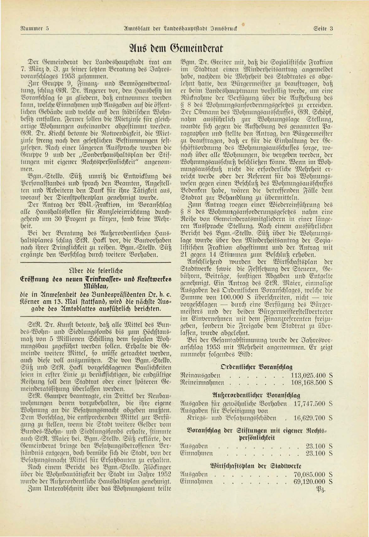 Bei der OesamtMtimuiung wurde der Iahresvoranschlug 1953 init Mehrheit^ angenoni"men. Er zeigt