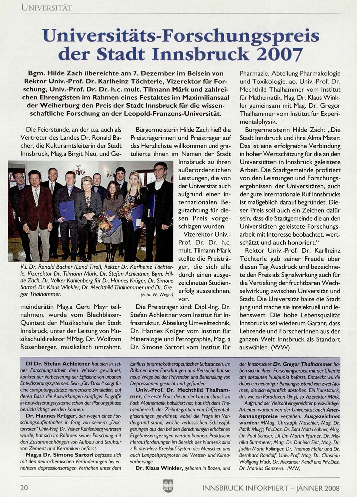 d e r W e i h e r b u r g d e n Preis d e r S t a d t I n n s b r u c k f ü r d i e w i s s e n s c h a f t l i c h e F o r s c h u n g an d e r L e o p o l d - F r a n z e n s - U n i v e r s i t ä t .