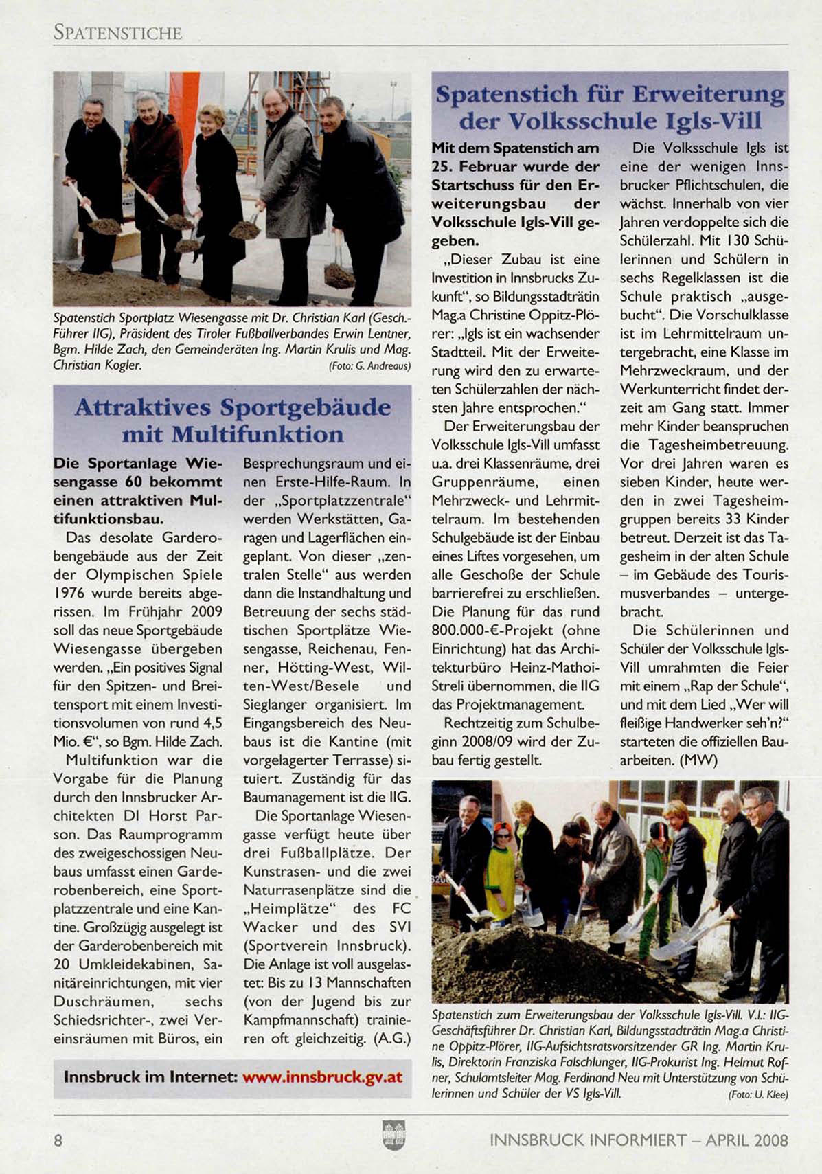 Spatenstich zum Erweiterungsbau der Volksschule Igls-Vill. V.l.: IIGKampfmannschaft) trainieSchiedsrichter-, zwei VerGeschäftsführer Dr. Christian Karl, Bildungsstadträtin Mag.a Christiren oft gleichzeitig. (A.G.)