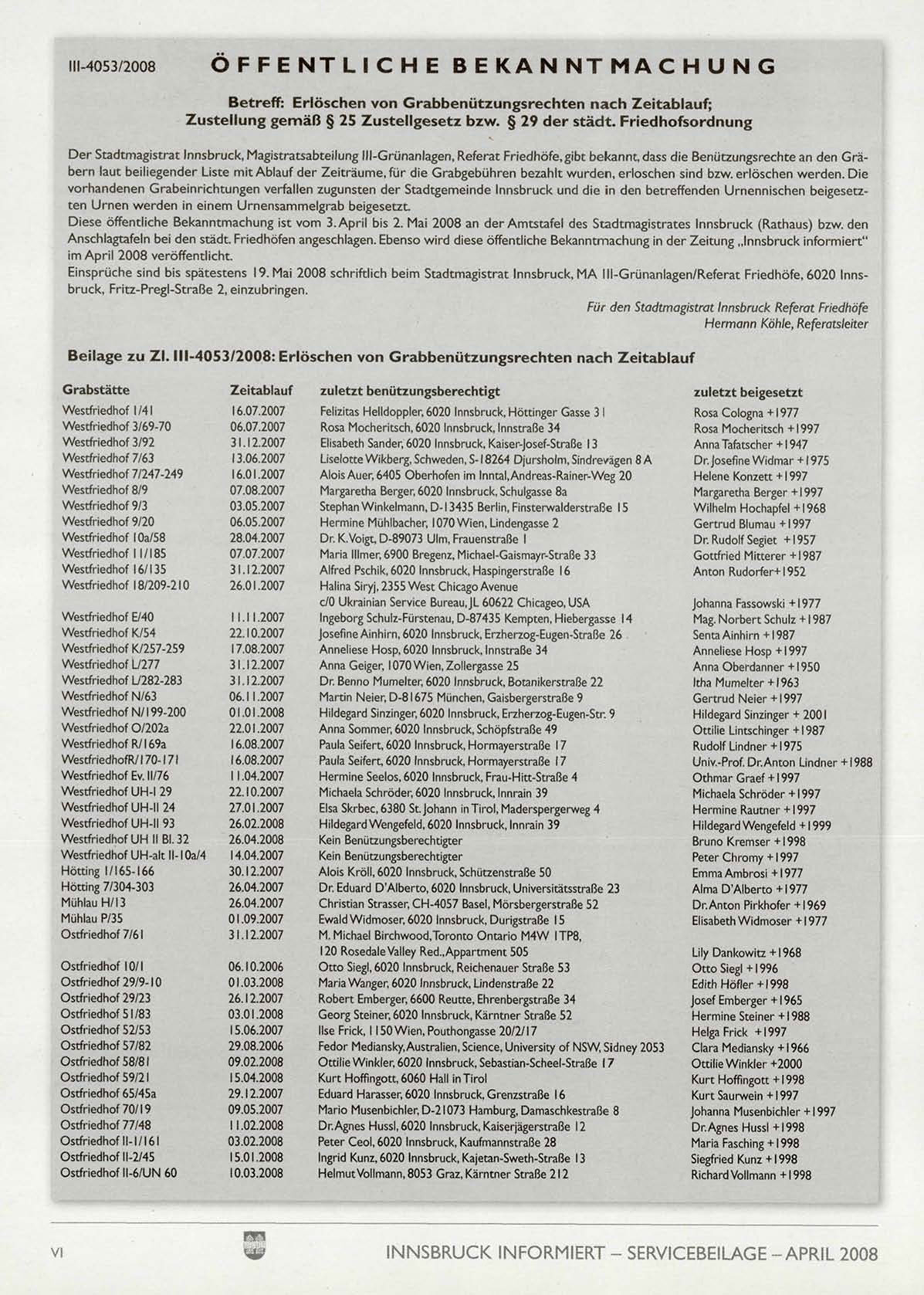 Einsprüche sind bis spätestens 19. Mai 2008 schriftlich beim Stadtmagistrat Innsbruck, M A Ml-Grünanlagen/Referat Friedhöfe, 6020 Innsbruck, Fritz-Pregl-Straße 2, einzubringen.