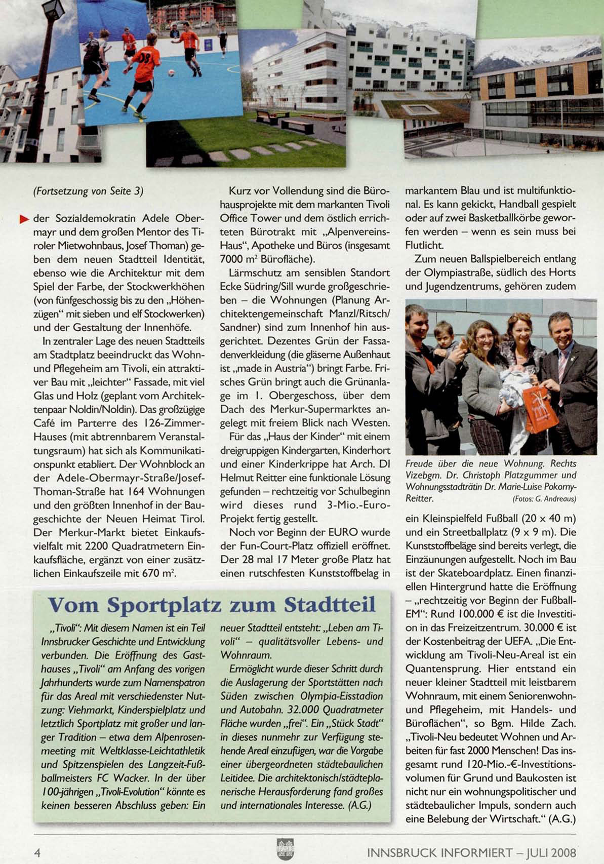der Sozialdemokratin Adele Obermayr und dem großen Mentor des Tiroler Mietwohnbaus, Josef Thoman) geben dem neuen Stadtteil Identität,