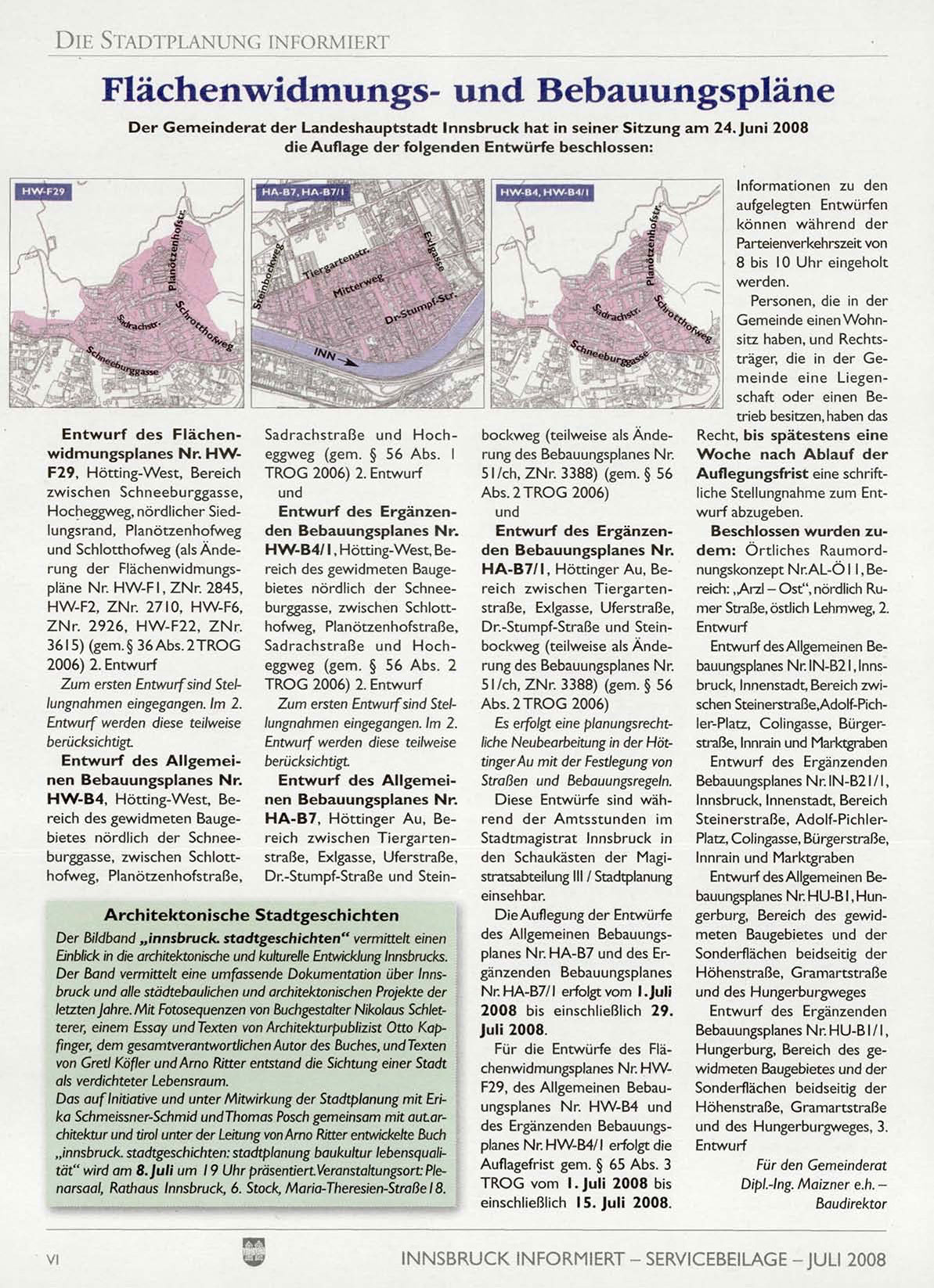 Das auf Initiative und unter Mitwirkung der Stadtplanung mit Erika Schmeissner-Schmid undThomas Posch gemeinsam mit autarchitektur und tirol unter der Leitung von Arno Fütter entwickelte Buch