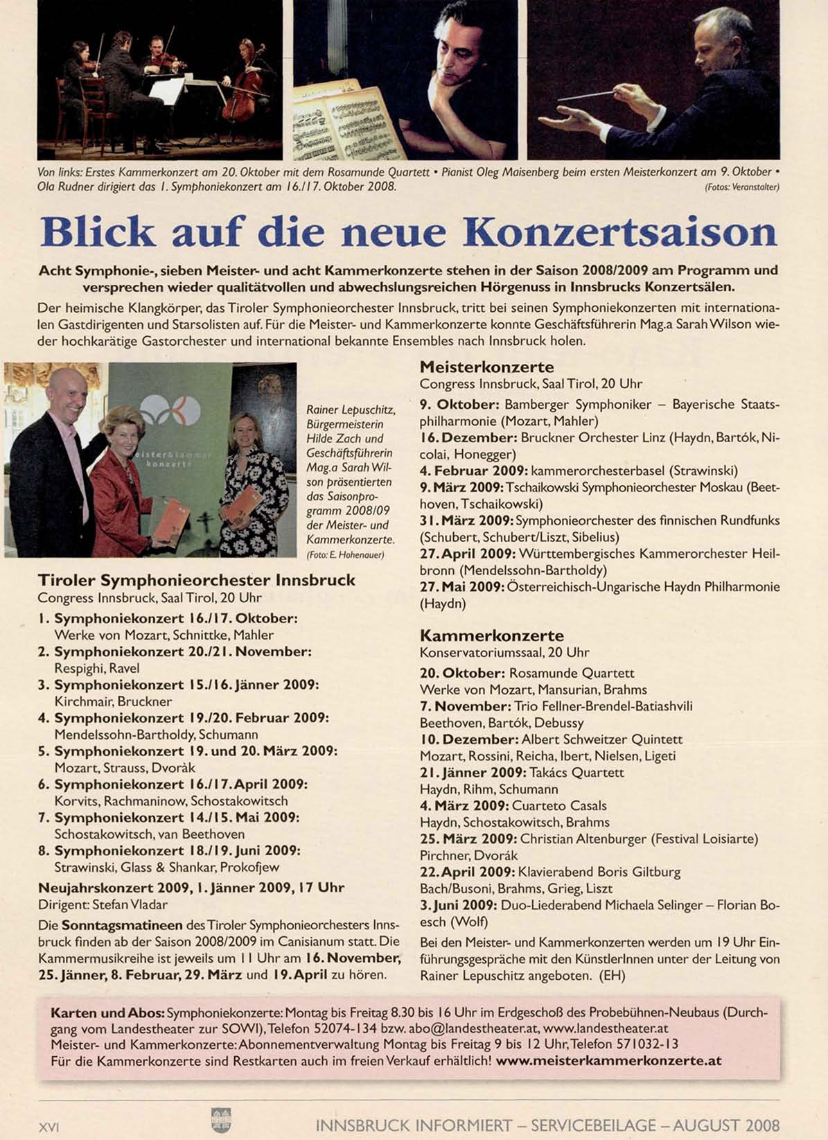D e r heimische Klangkörper, das Tiroler Symphonieorchester Innsbruck, t r i t t bei seinen Symphoniekonzerten mit internationalen Gastdirigenten und Starsolisten auf. Für die Meister- und Kammerkonzerte konnte Geschäftsführerin Mag.a Sarah W i l s o n wieder hochkarätige Gastorchester und international bekannte Ensembles nach Innsbruck holen.
