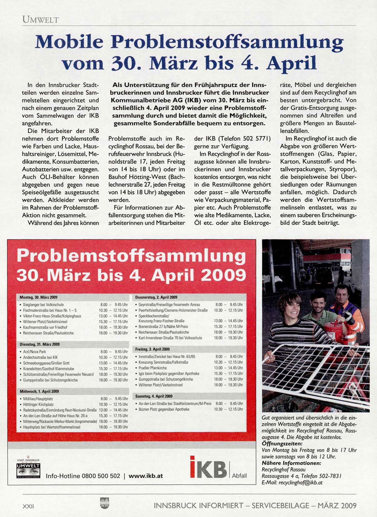 K o m m u n a l b e t r i e b e A G ( I K B ) v o m 3 0 . M ä r z bis e i n schließlich 4. A p r i l 2009 w i e d e r eine P r o b l e m s t o f f s a m m l u n g durch und bietet d a m i t die Möglichkeit,