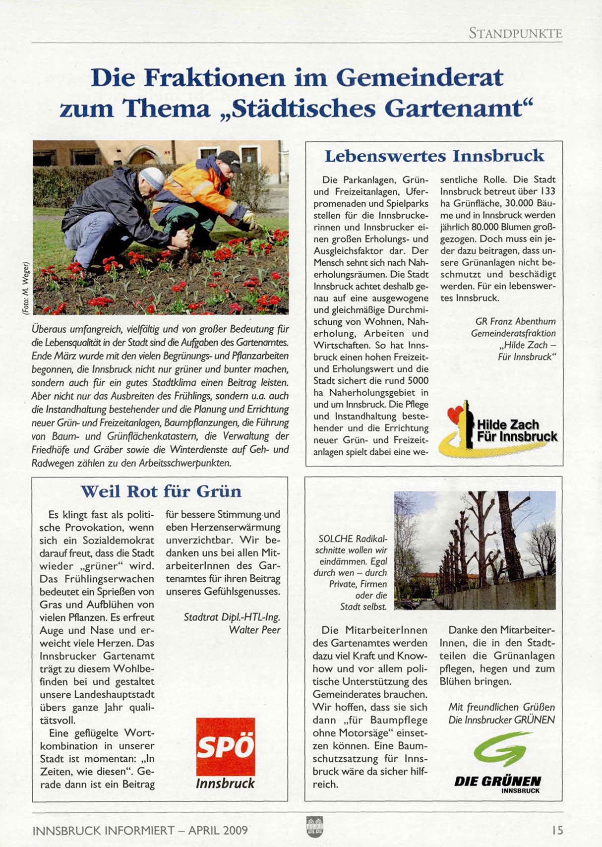 die Lebensqualität in der Stadt sind die Aufgaben des Gartenamtes. Wirtschaften. So hat InnsEnde März wurde mit den vielen Begrünungs- und Pflanzarbeiten bruck einen hohen Freizeitund Erholungswert und die
