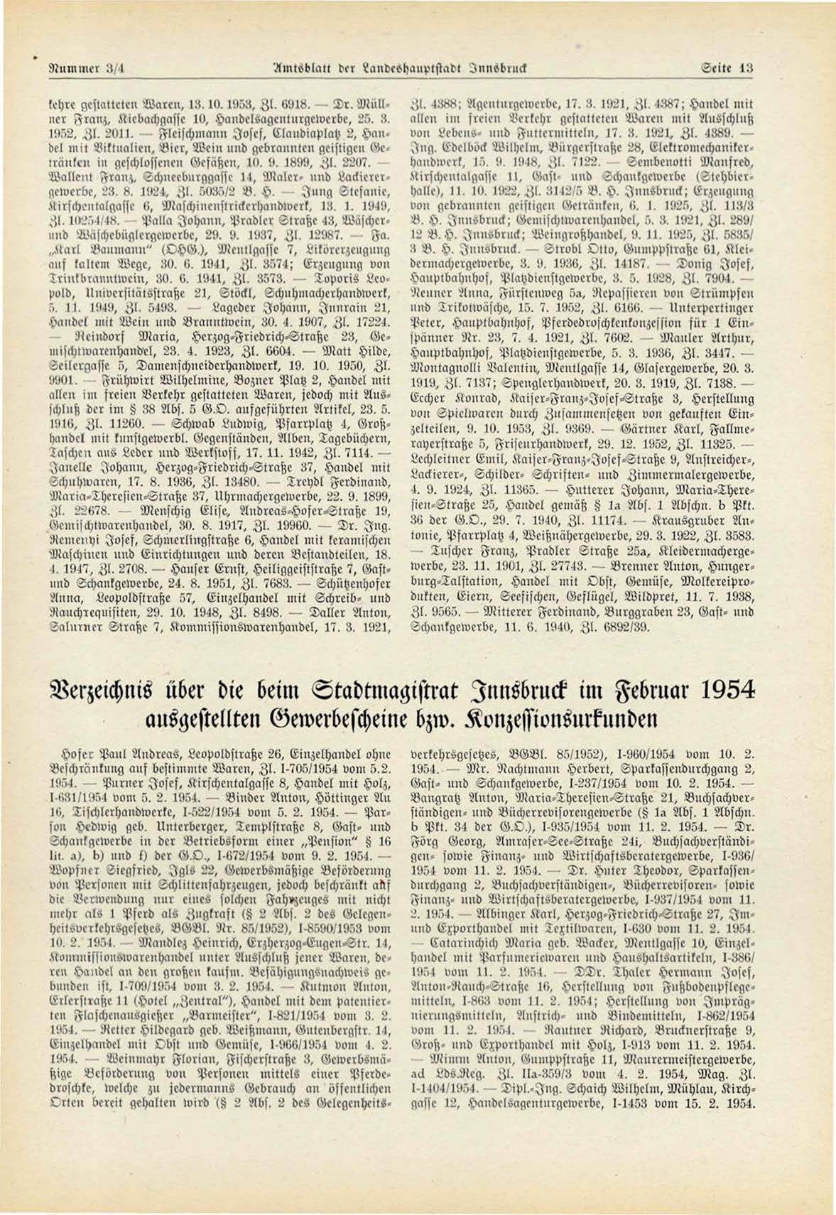 Verzeichnis über die beim ^tadtmagisttat Innsbruck im Februar 1954