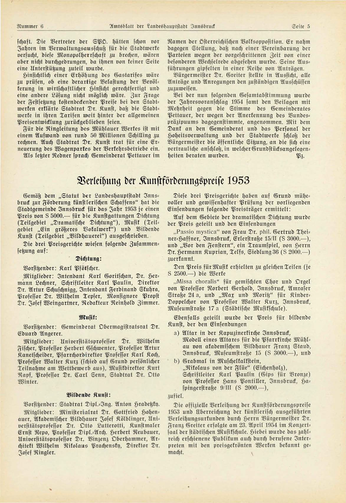 Stadtgemeinde Innsbruck für das Jahr 1953 je einen