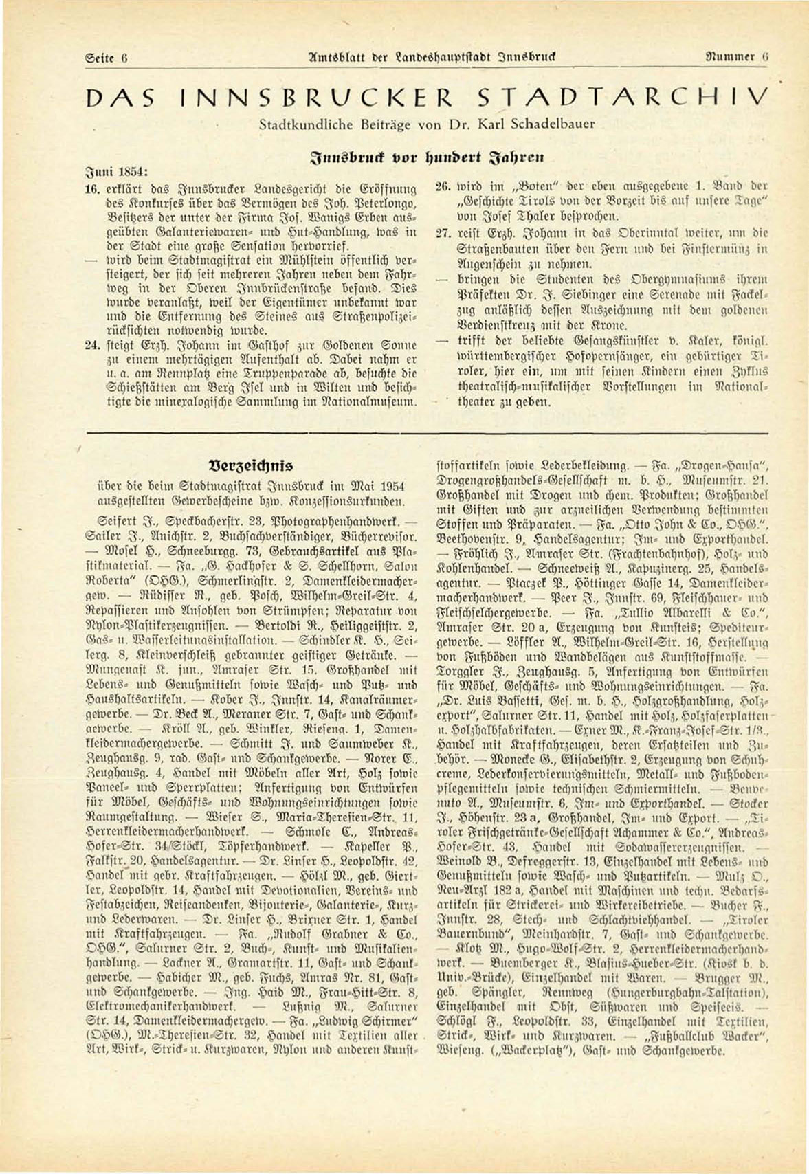 über die beim Stadtmagistrat Innsbruck im Mai 1954