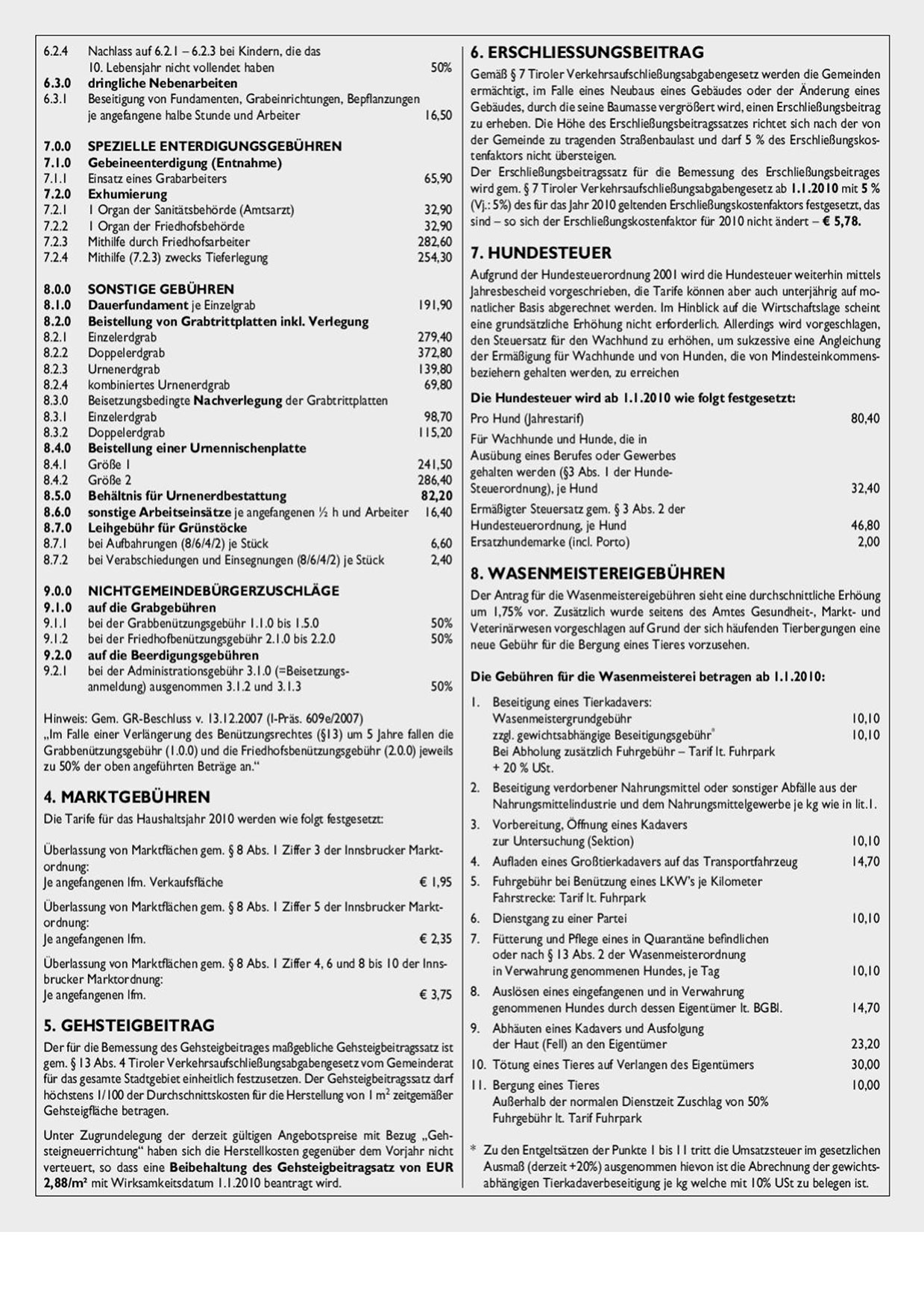 Die Tarife für das Haushaltsjahr 2010 werden wie folgt festgesetzt: