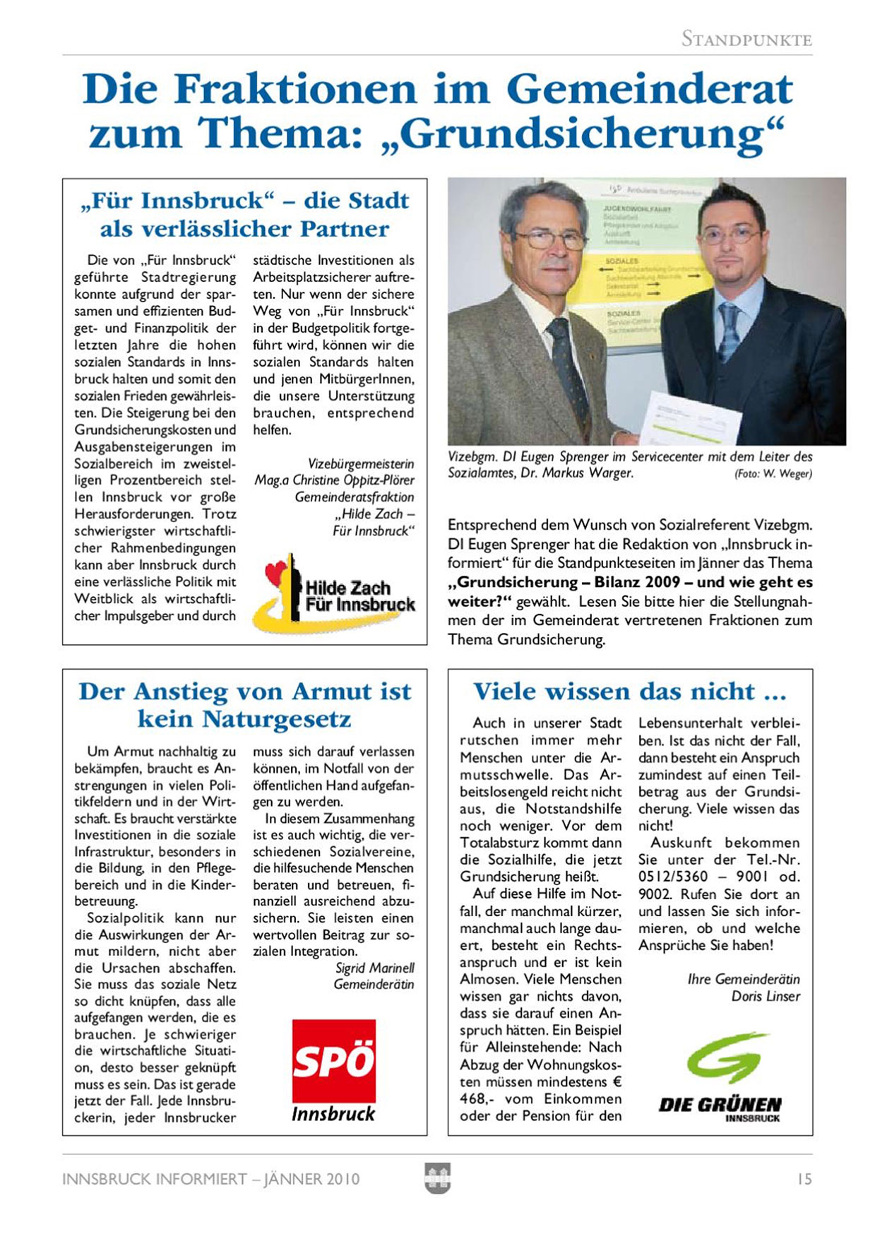 Entsprechend dem Wunsch von Sozialreferent Vizebgm. Dl Eugen Sprenger hat die Redaktion von „Innsbruck informiert“ für die Standpunkteseiten im jänner das Thema „Grundsicherung - Bilanz 2009 — und wie geht es weiter!“ gewählt. Lesen Sie bitte hier die Stellungnahmen der im Gemeinderat vertretenen Fraktionen zum Thema Grundsicherung.