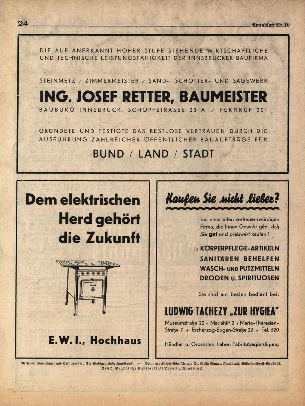 Verleger, Eigentümer und Herausgeber: Nie Stadtgemeinde Innsbruck. — Verantwortlicher Schriftleiter: 2>r. Willy Rumer, Innsbruck, Wilhelm-Greil-Straße 25.