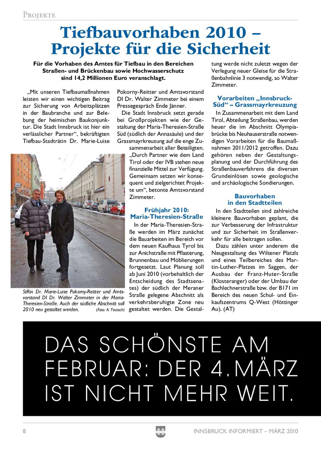 Frühjahr 2010: Maria-Theresien-Straße In der Maria-Theresien-StraBe werden im März zunächst die Bauarbeiten im Bereich vor dem neuen Kaufhaus Tyrol bis zur Anichstraße mit Pflasterung, Brunnenbau und Möblierungen fortgesetzt. Laut Planung soll ab juni 2010 (vorbehaltlich der Entscheidung des