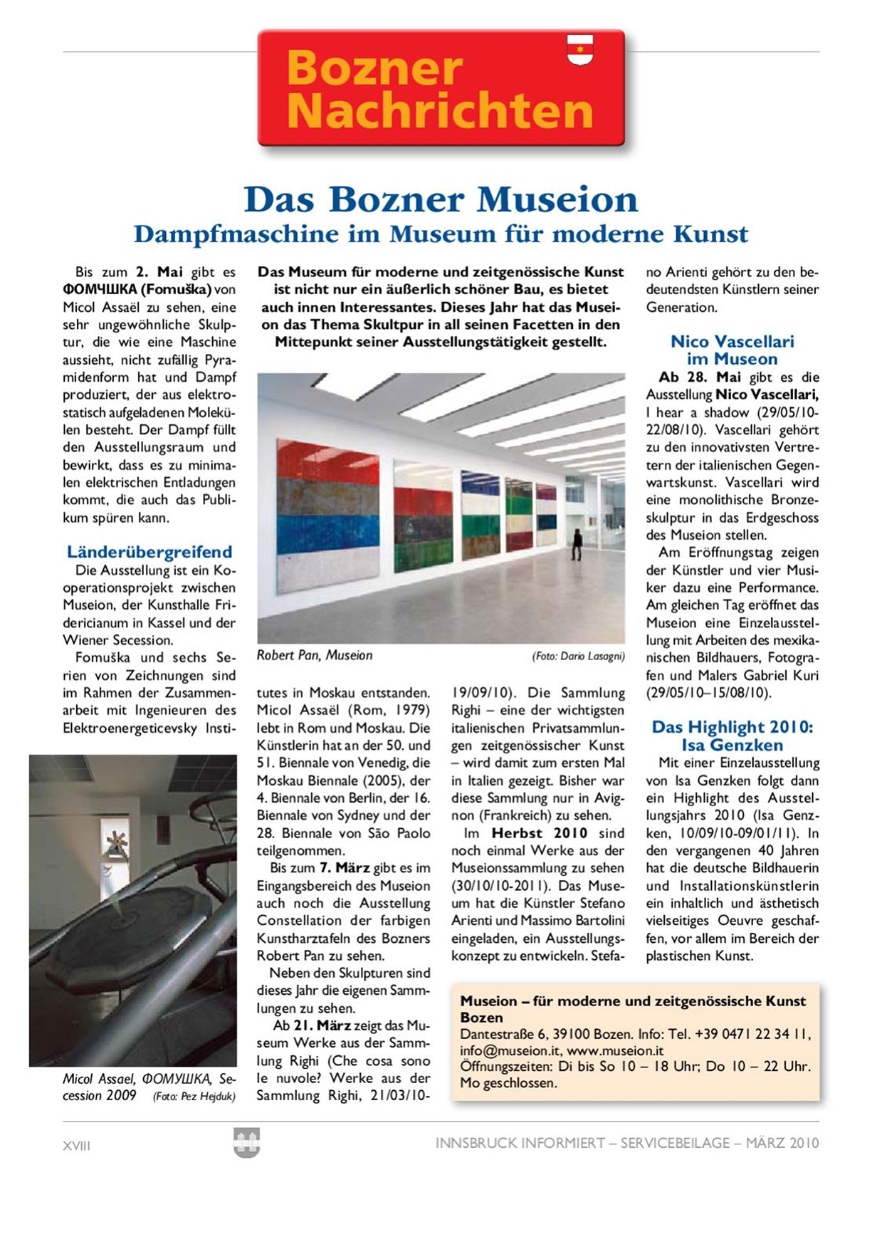 Im Herbst 2010 sind noch einmal Werke aus der Museionssammlung zu sehen (30/10/10-20Il). Das Museum hat die Künstler Stefano Arienti und Massimo Bartolini eingeladen, ein Ausstellungskonzept zu entwickeln. Stefa