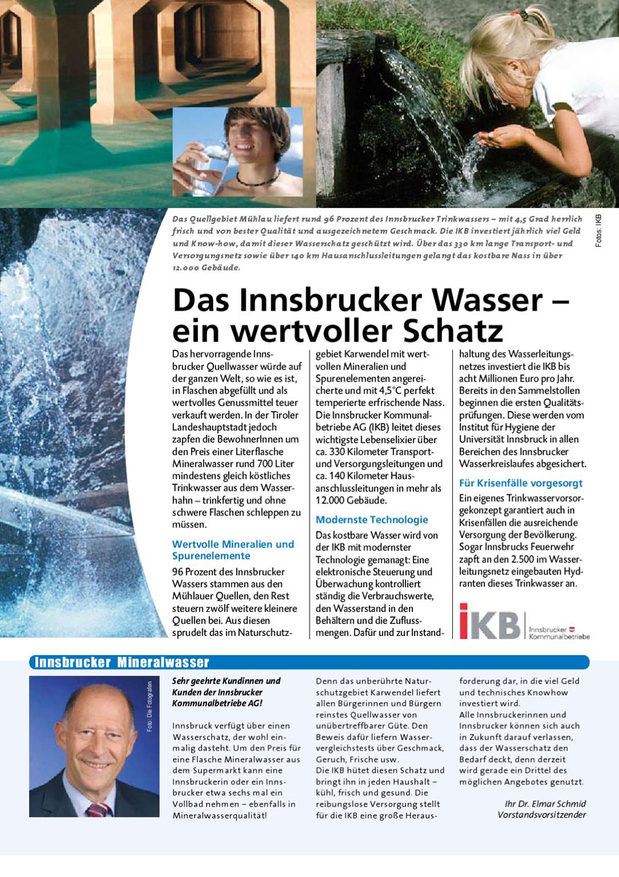 gebiet Karwendel mit wertvollen Mineralien und Spurenelementen angereicherte und mit 4,5°Cperfekt temperierte erfrischende Nass. Die Innsbrucker Kommunalbetriebe AG (IKB) leitet dieses wichtigste Lebenselixier über ca. 330 Kilometer Transportund Versorgungsleitungen und ca. 140 Kilometer
