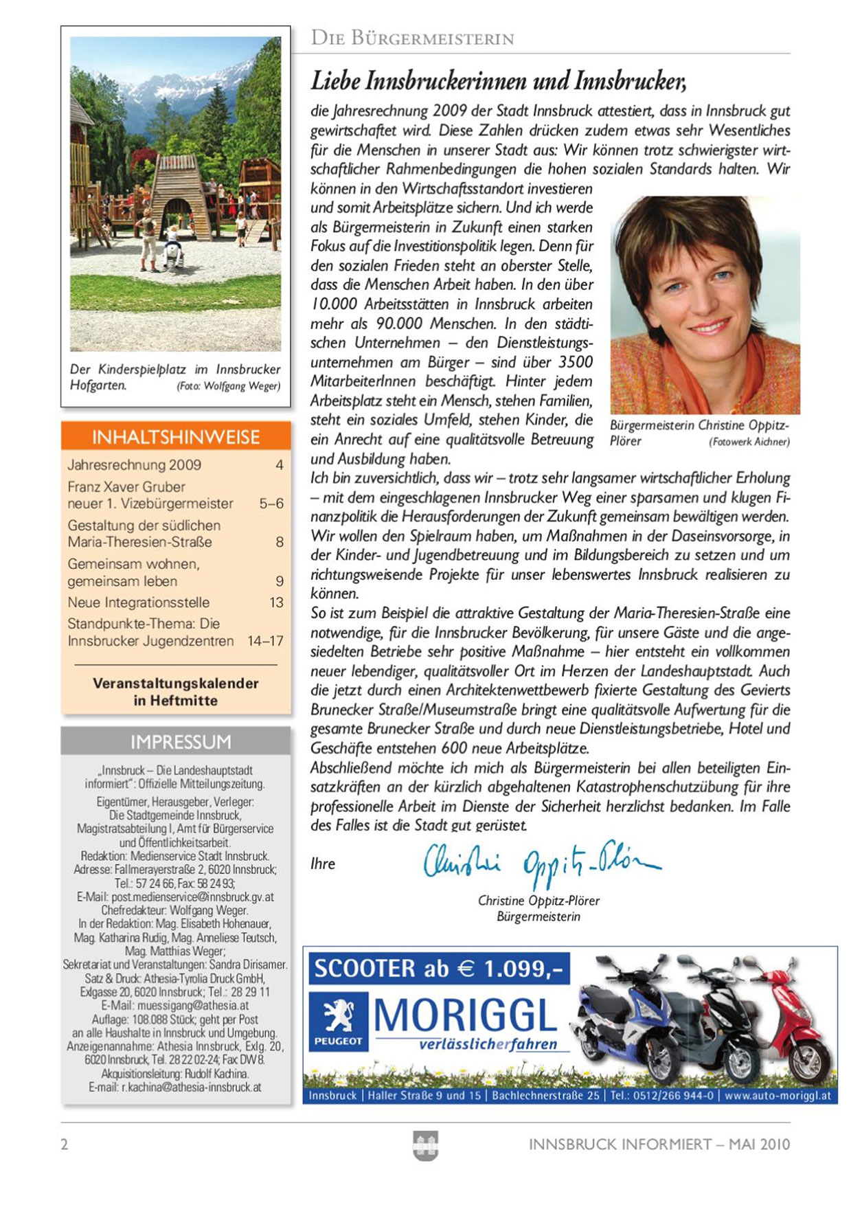 die jahresrechnung 2009 der Stadt Innsbruck attestiert, dass in Innsbruck gut gewirtschaftet wird. Diese Zahlen drücken zudem etwas sehr Wesentliches für die Menschen in unserer Stadt aus: Wir können trotz schwierigster wirtschaftlicher Rahmenbedingungen