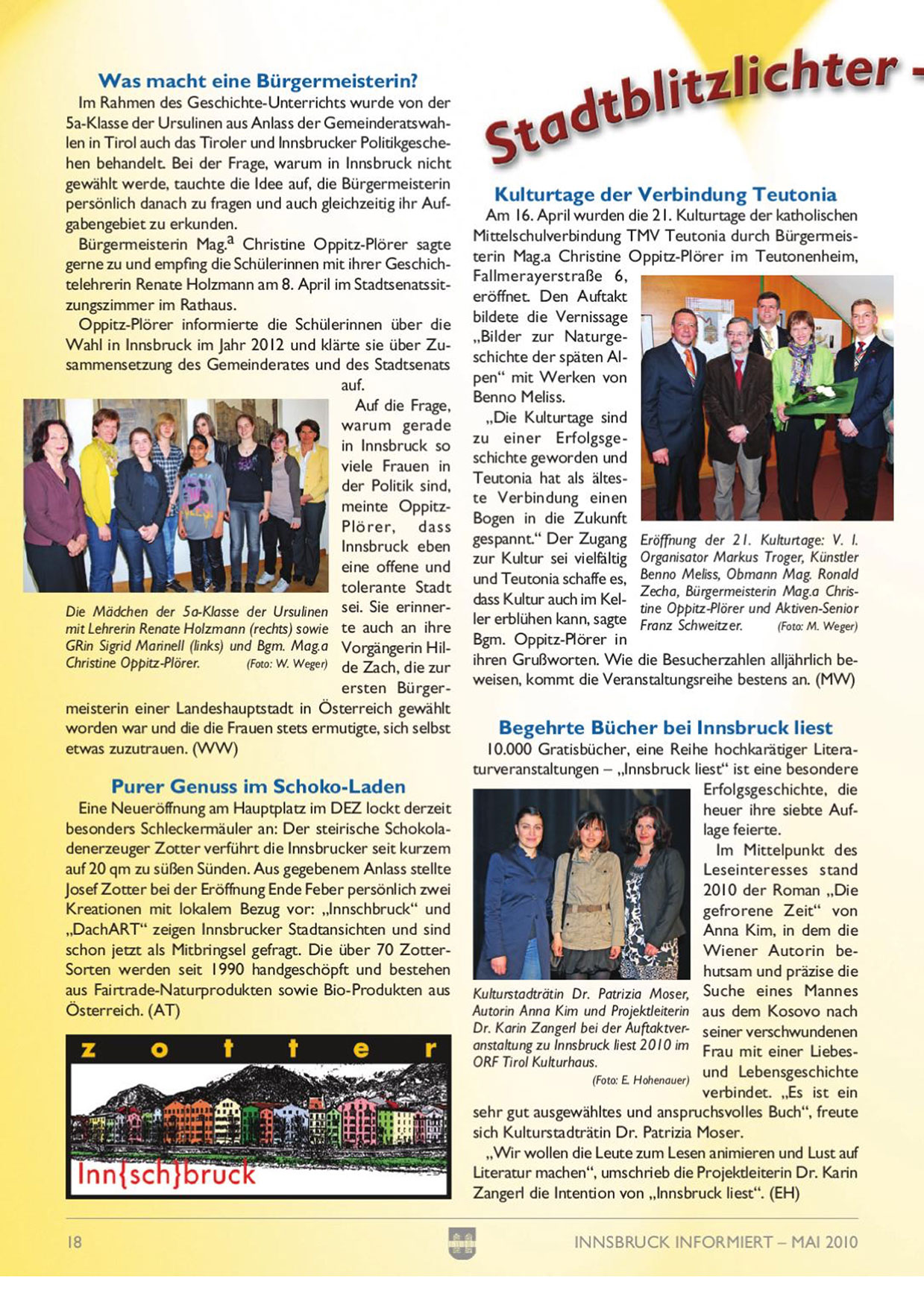 Kulturtage der Verbindung Teutonia Am 16. April wurden die 21. Kulturtage der katholischen Mittelschulverbindung TMIV Teutonia durch Bürgermeisterin Mag.a Christine Oppitz-Plörer im Teutonenheim, Fallmerayerstraße 6, eröffnet. Den Auftakt bildete die