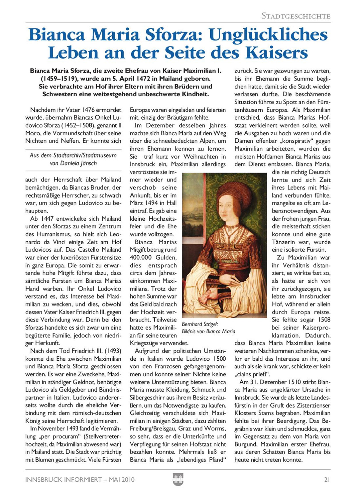 im Gegensatz zu dem von Maria von Burgund, Maximilian erster Ehefrau, aus deren Schatten Bianca Maria bis heute nicht treten konnte.