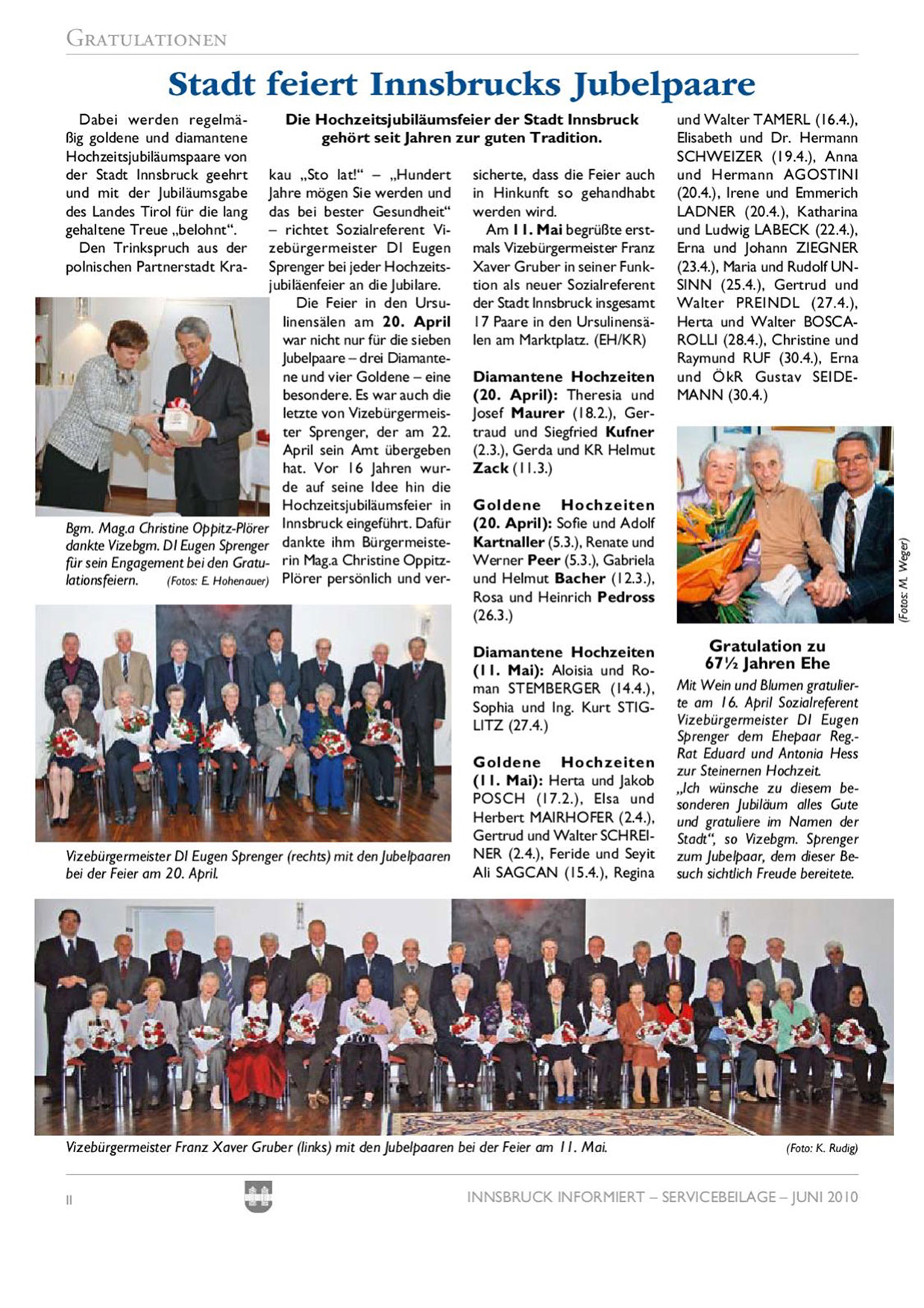 Dabei werden regelmäBig goldene und diamantene Hochzeitsjubiläumspaare von der Stadt Innsbruck geehrt und mit der Jubiläumsgabe des Landes Tirol für die lang gehaltene Treue „belohnt“.