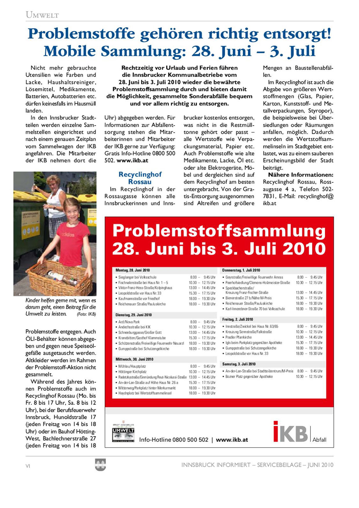 Rechtzeitig vor Urlaub und Ferien führen die Innsbrucker Kommunalbetriebe vom 28. Juni bis 3. Juli 2010 wieder die bewährte Problemstoffsammlung durch und bieten damit die Möglichkeit, gesammelte Sonderabfälle bequem und vor allem richtig zu