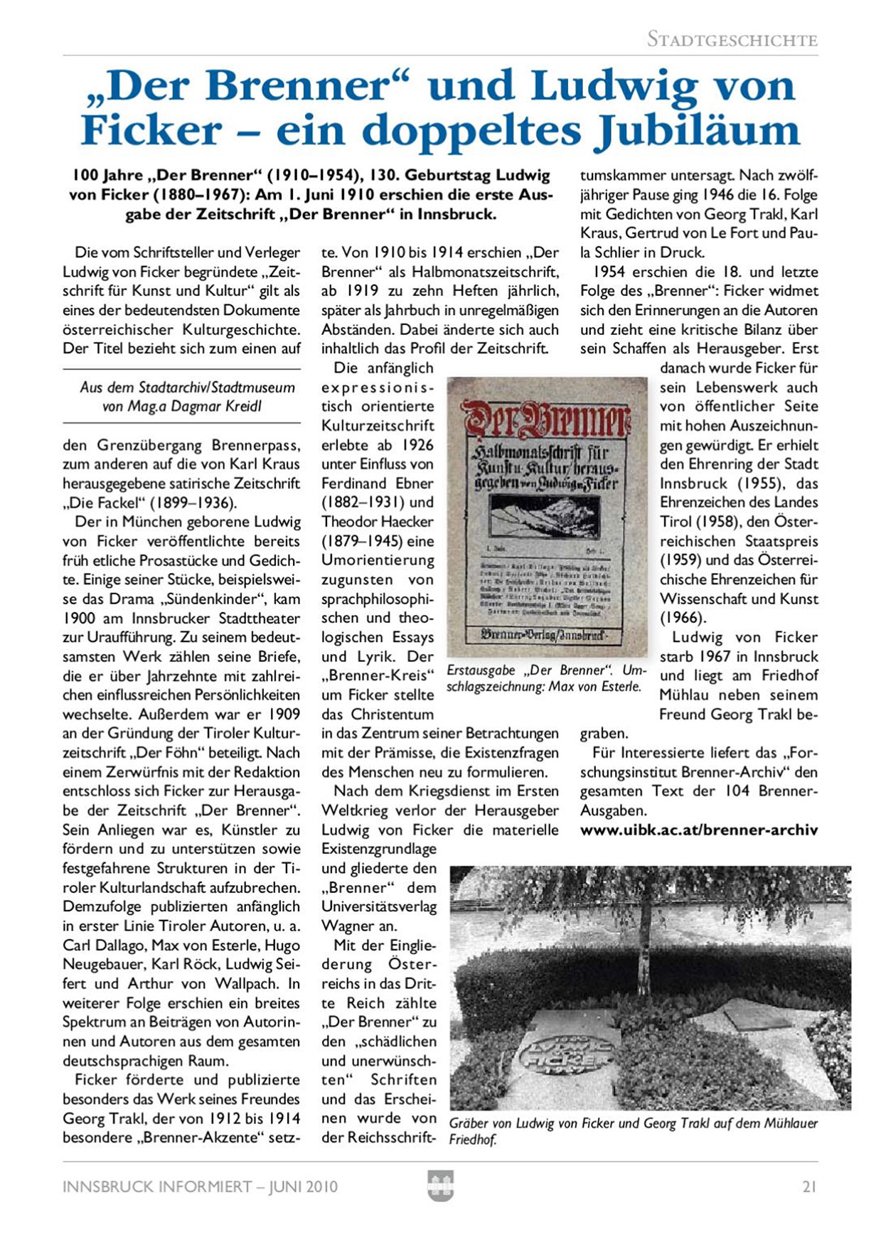 Ficker zur Herausgabe der Zeitschrift „Der Brenner“. Sein Anliegen war es, Künstler zu fördern und zu unterstützen sowie festgefahrene Strukturen in der Tiroler Kulturlandschaft aufzubrechen. Demzufolge publizierten anfänglich in erster Linie Tiroler Autoren,