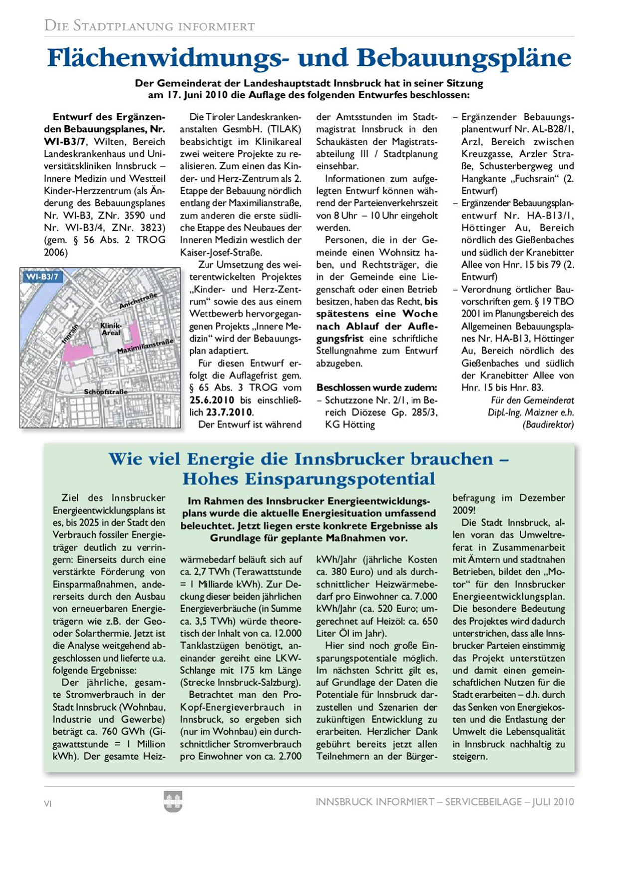 Der Gemeinderat der Landeshauptstadt Innsbruck hat in seiner Sitzung am 17. Juni 2010 die Auflage des folgenden Entwurfes beschlossen: