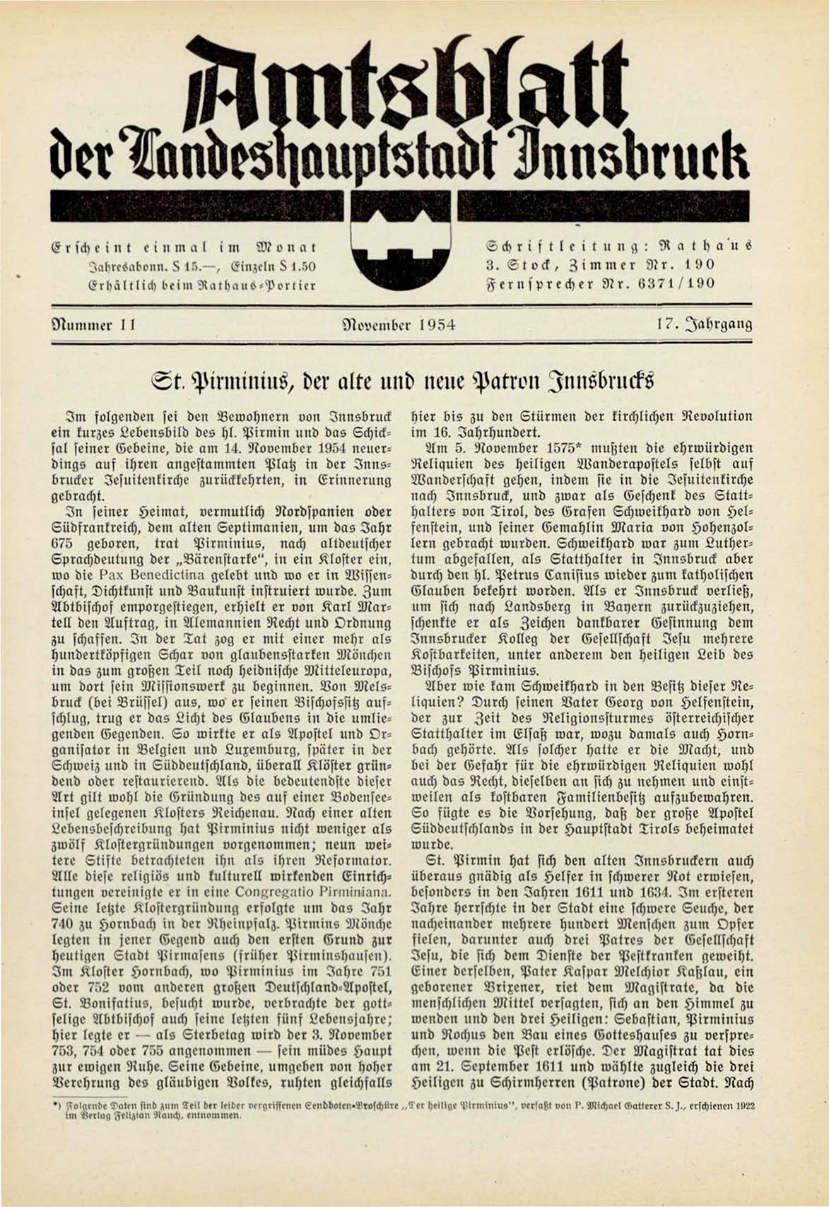 ein kurzes Lebensbild des hl. Pirmin und das Schicksal seiner Gebeine, die am 14. November 1954 neuerdings auf ihren angestammten Platz in der Innsbrucker Iesuitenkirche zurückkehrten, in Erinnerung