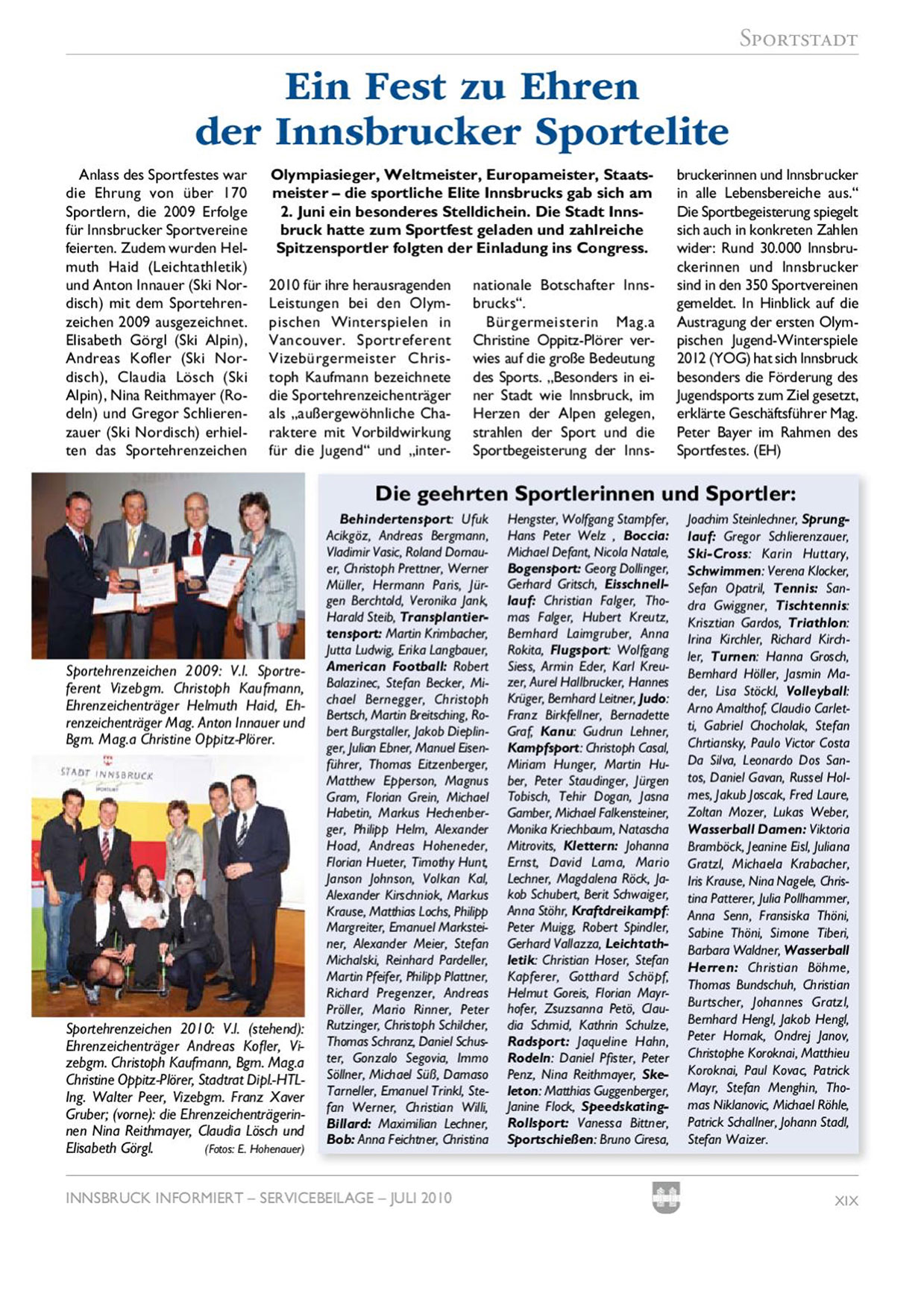 Sportehrenzeichen 2010: VI. (stehend): Ehrenzeichenträger Andreas Kofler, Vizebgm. Christoph Kaufmann, Bgm. Mag.o Christine Oppitz-Plörer, Stadtrat Dipl-HTLIng. Walter Peer, Vizebgm. Franz Xqver Gruber; (vorne): die Ehrenzeichenträgerinnen Nina