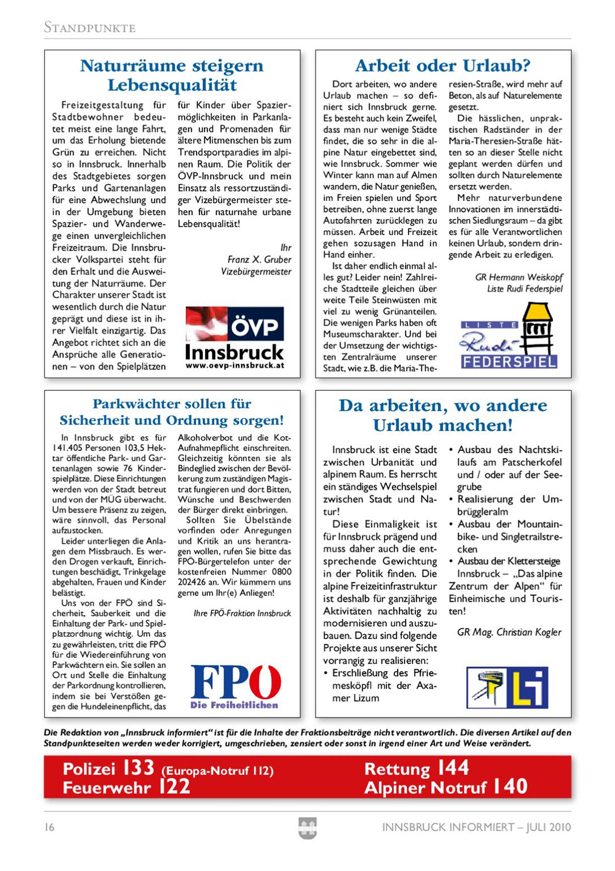 für Kinder über Spaziermöglichkeiten in Parkanlagen und Promenaden für ältere Mitmenschen bis zum Trendsportparadies im alpinen Raum. Die Politik der OVP-Innsbruck und mein Einsatz als ressortzuständiger Vizebürgermeister stehen für naturnahe